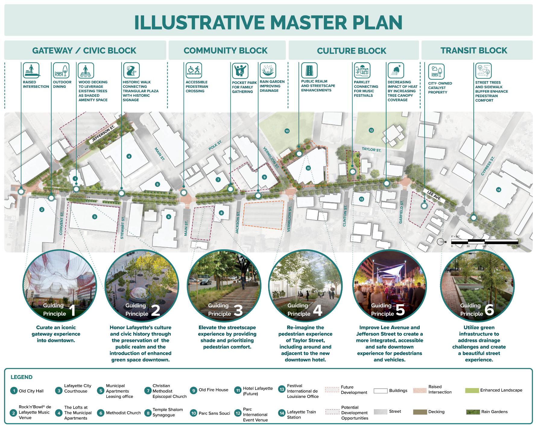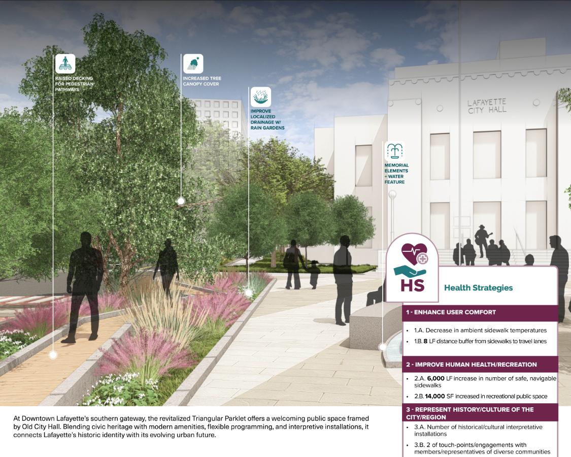 The Downtown Lafayette Corridor Revitalization Plan transforms Jefferson Street and Lee Avenue from overlooked backstreets into vibrant, pedestrian corridors that celebrate Lafayette’s cultural legacy while addressing historic flooding. Corridors are envisioned as welcoming gateways; weaving green infrastructure, public art, and cultural spaces into a framework that supports local businesses, events, and community life. Lafayette’s first inclusive, transparent engagement process was central to shaping a shared vision for revitalization and long-term stewardship. Rooted in history and firmly focused on the future, the plan balances preservation with innovation through sustainable strategies that enhance comfort, accessibility, and resilience.