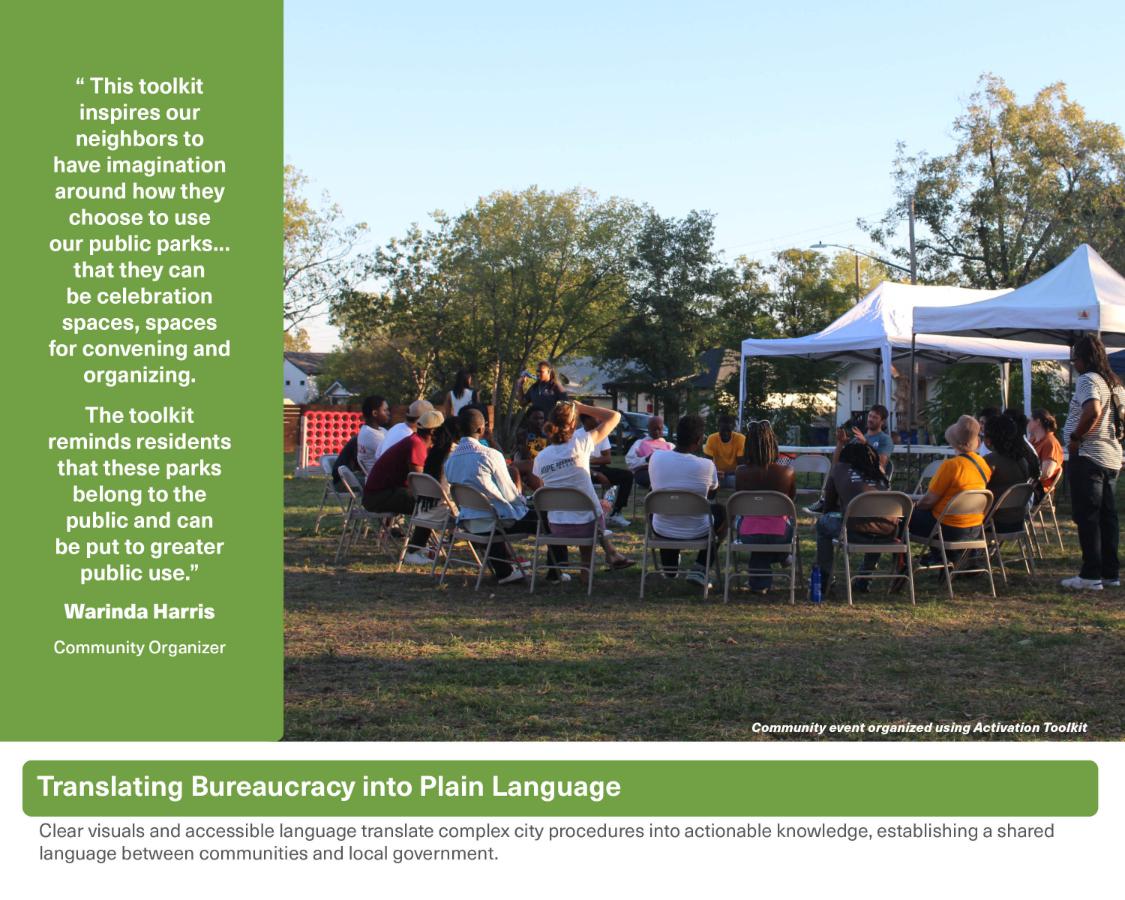 The Austin Parks Activation Toolkit is a publicly accessible digital and printable guide that simplifies Austin’s park permitting and funding systems. Created for grassroots outreach and resident training, it translates complex processes into clear, visual steps, empowering communities to plan safe, legal activations and speak the same procedural language as local government. By turning bureaucracy into actionable strategies, the toolkit fosters equity, collaboration, and place-making. This innovative, replicable model enables communities nationwide to reclaim vacant parkland and transform it into vibrant, inclusive spaces.
