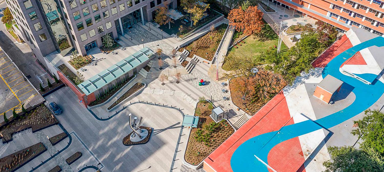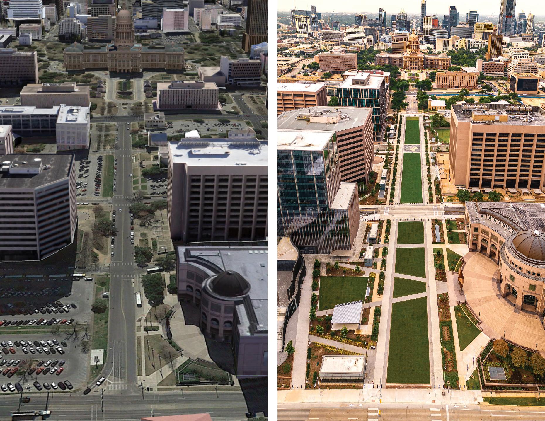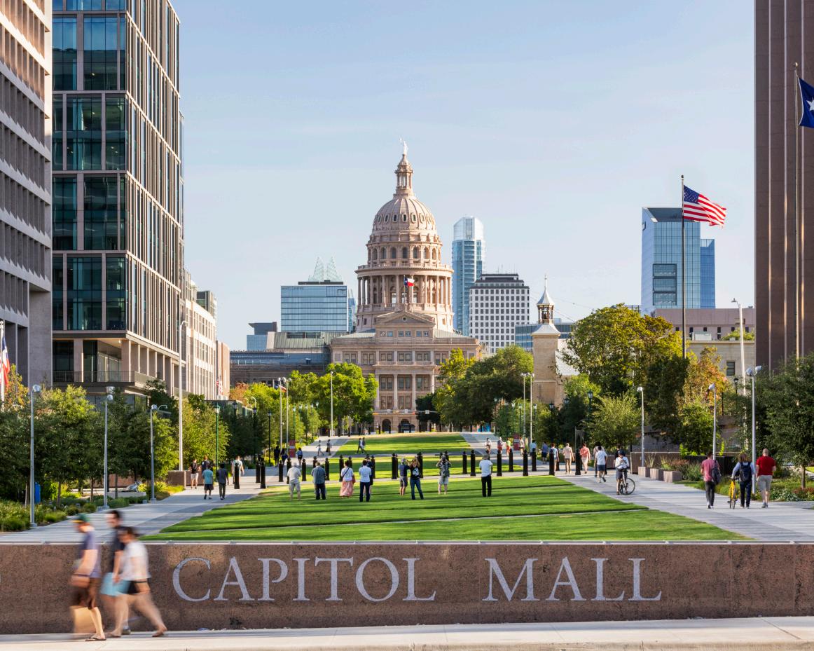The new Texas Capitol Mall transformed a street between the Capitol and The University of Texas campus into a pedestrian-only destination above a subsurface garage, creating the largest rooftop garden in Central Texas. This new destination includes several state office buildings replacing scattered lease spaces around Austin, thus reducing automobile commutes and operating costs while creating cohesion and community. The Mall eliminates vehicle use, reduces heat island effect, and provides stormwater management and biofiltration, with the ultimate result being a significant open space serving as a healthy and vibrant destination for employees and visitors.