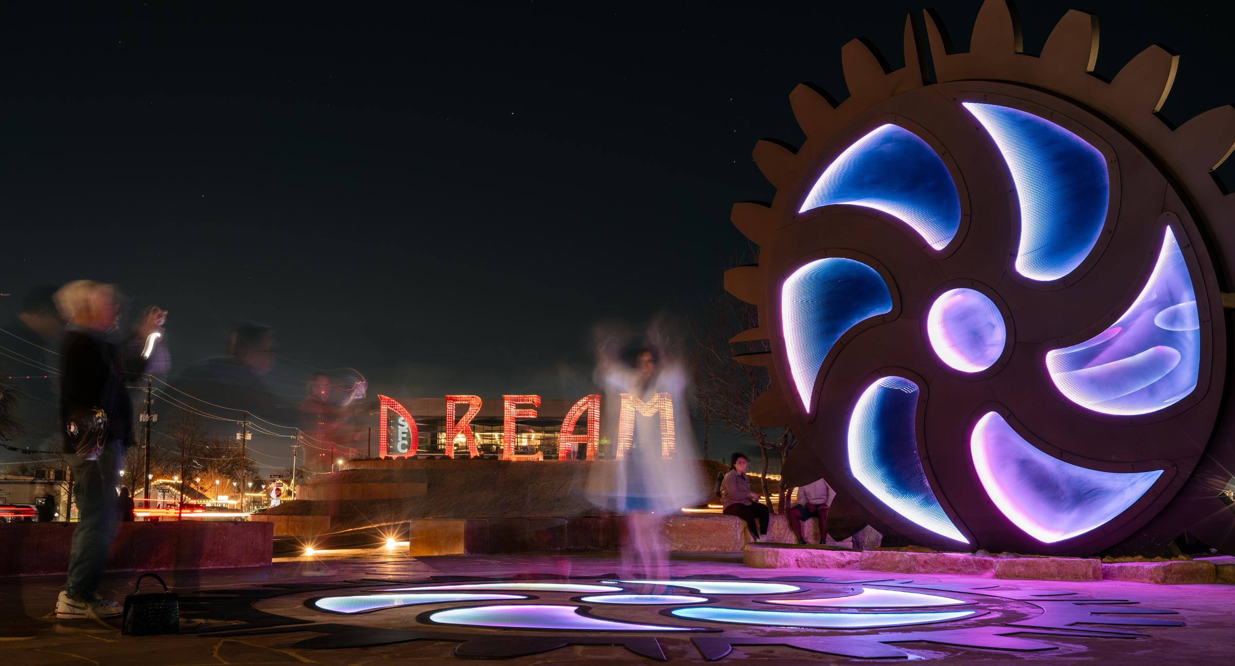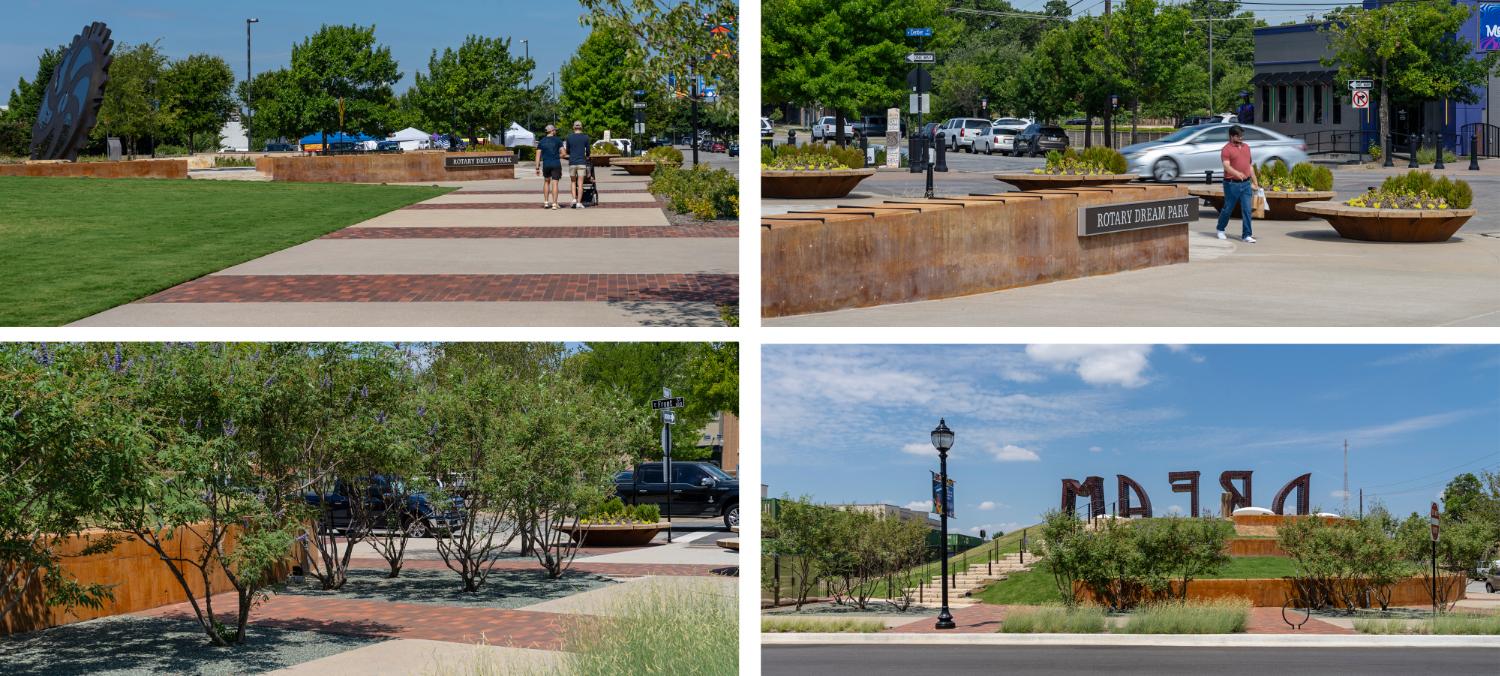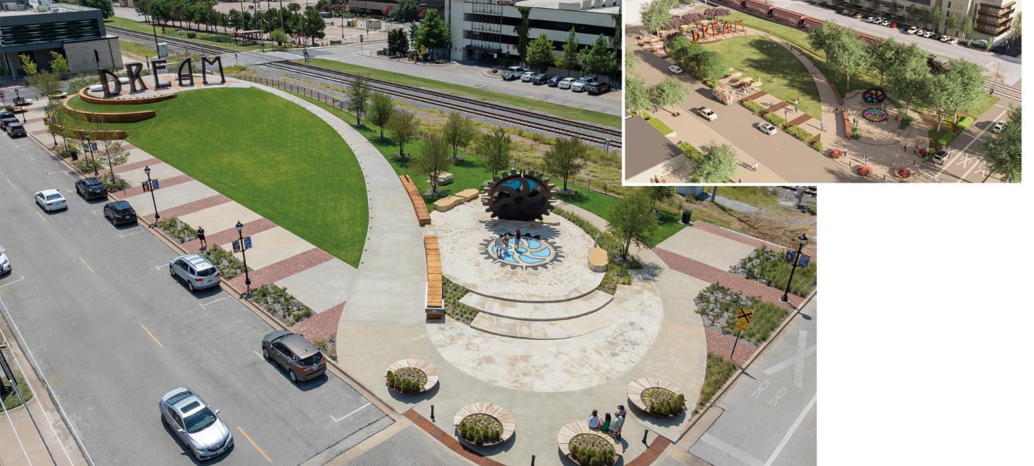 Rotary Dream Park transforms an underutilized downtown site into a vibrant civic destination that unites monumental public art, green space, and community identity. Anchored by the iconic DREAM and BOUNDLESS sculptures, the park blends art, recreation, and placemaking to create an inviting gathering space for all users. Sustainable design strategies— including native landscaping and pedestrian-focused amenities— enhance walkability and long-term performance. The park has catalyzed downtown activation, increased foot traffic, and strengthened Arlington’s cultural and economic vitality.