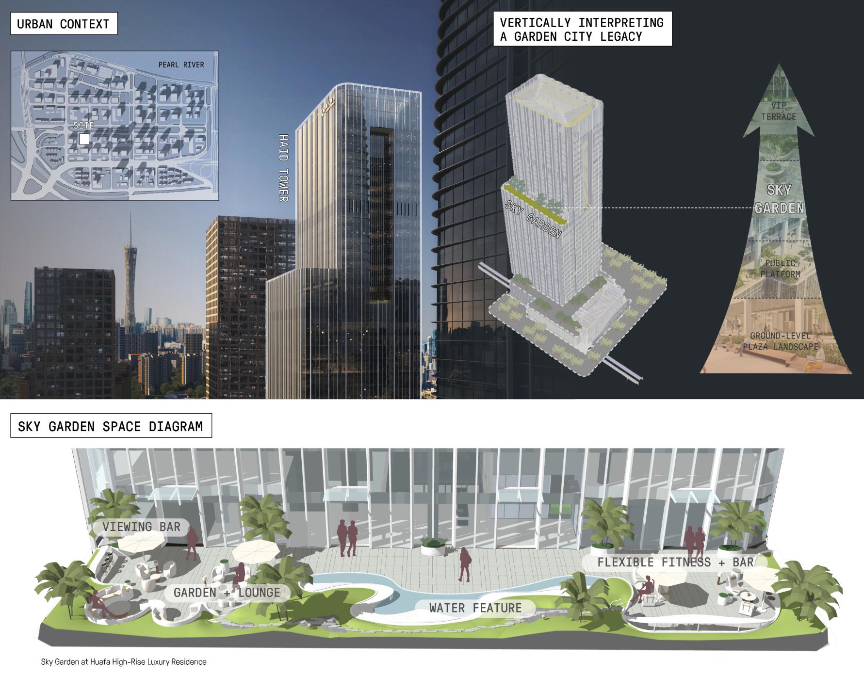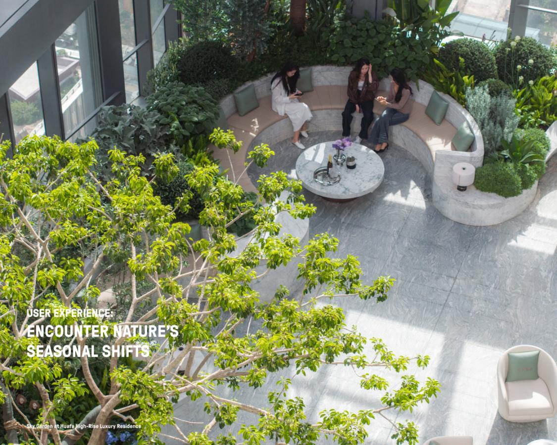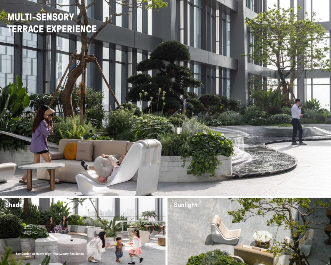 Perched 22 stories above Guangzhou's tech-driven Pazhou district, the Sky Garden transforms a scarce 12-meterwide rooftop into a thriving vertical ecosystem in a city where green roof infrastructure is limited. Native plantings create layered habitats that support pollinators and reconnect tower residents with nature. Curved seating, flowing water features, and terraces shape intimate gathering spaces linking the gym, tea room, and lounge, while cascading water help to cool the microclimate by 6°F. Warm circadian lighting extends evening use, demonstrating that ecologically sophisticated landscapes can thrive under extreme vertical constraints.