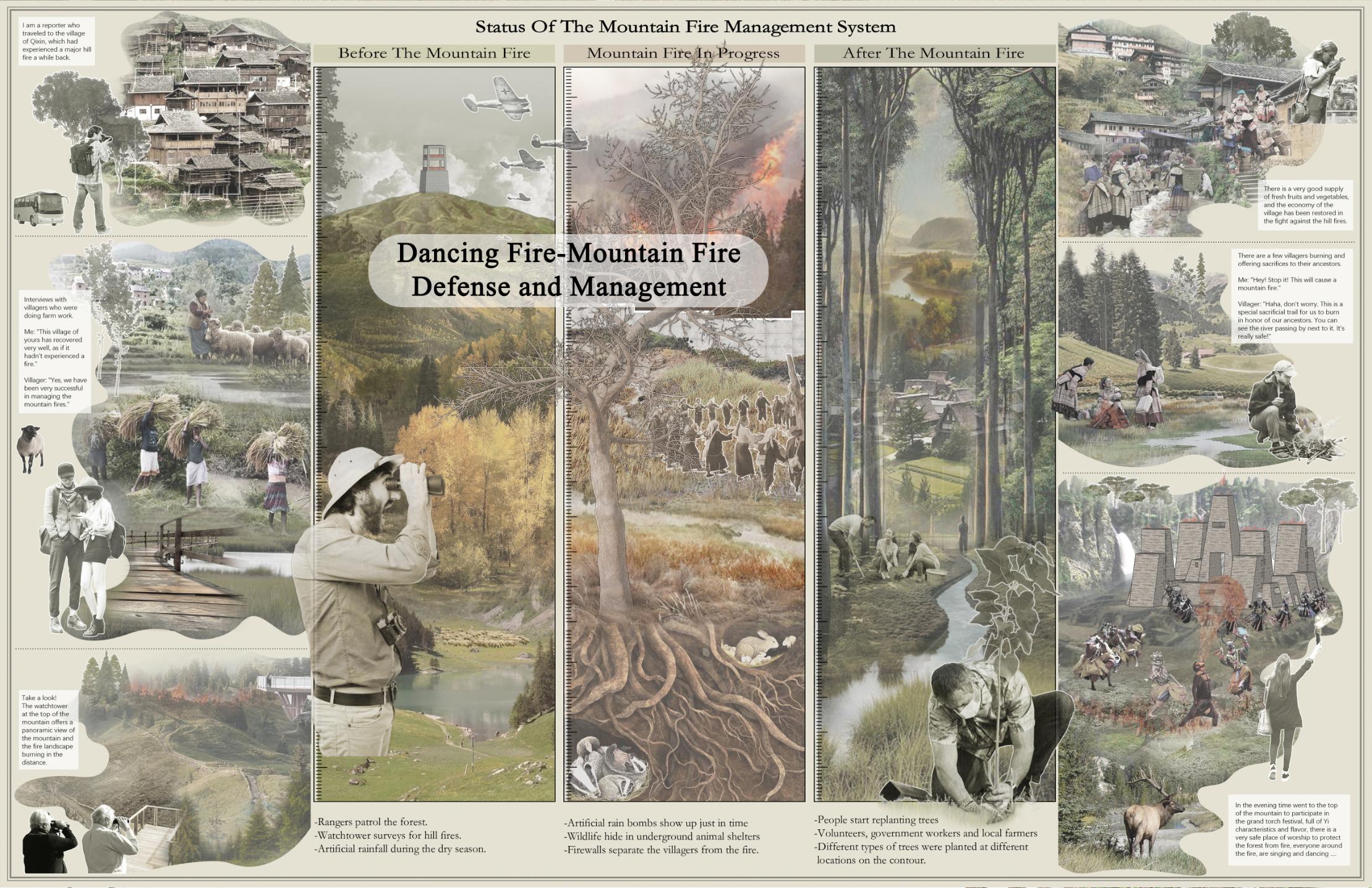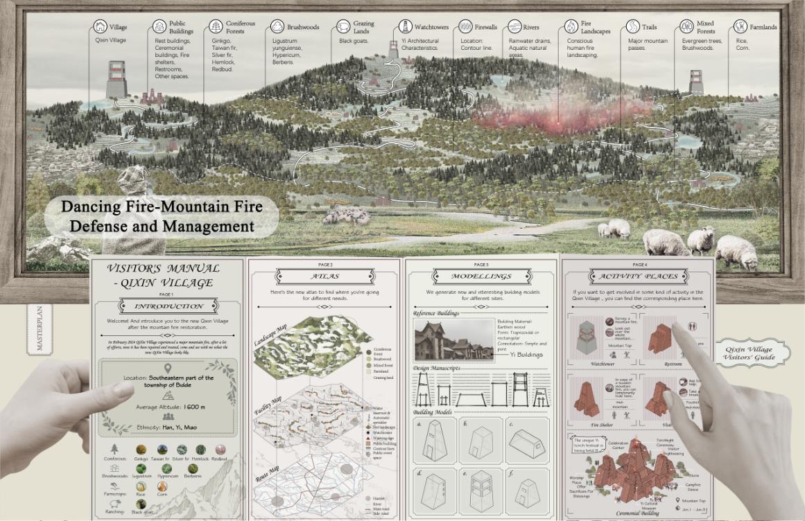 "Dancing Fire" is a mountain fire defense and management project in Guizhou Province, aiming to establish an effective fire prevention system by integrating modern technology with traditional wisdom. The design includes fire monitoring, early warning systems, firebreaks, and emergency shelters to address the complex terrain and climate conditions of the region. The project uses drones and remote sensing technology to monitor and predict fires in real-time, while combining community education with traditional fire prevention methods to raise local awareness. The design focuses not only on fire prevention but also on post-fire recovery, emphasizing ecological restoration.