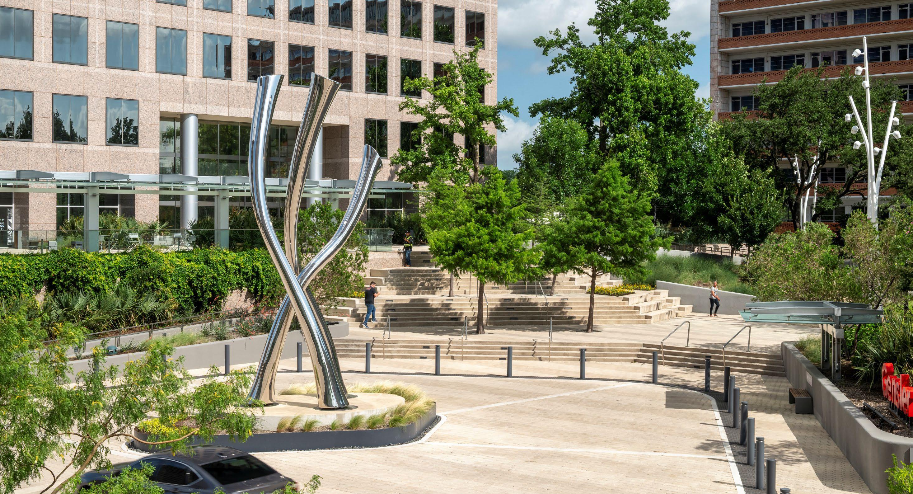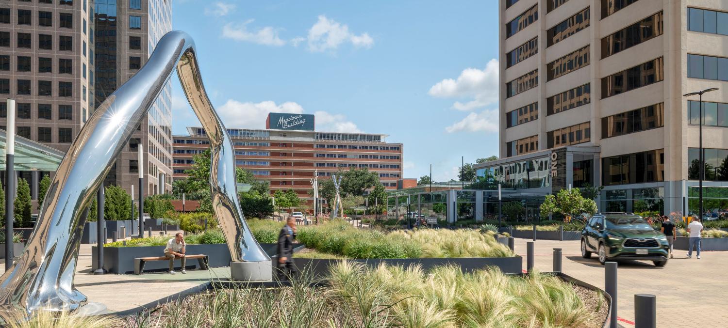 The Energy Square campus redesign transforms a fragmented, multi-era office complex into a cohesive pedestrian-oriented environment anchored by the historic Meadows Building. Through landscape architecture, the project unifies four disparate buildings, resolves complex structural constraints, and creates a clear campus identity. Inspired by midcentury modern principles, the design integrates native and naturalized planting, preserves mature trees, and balances vehicular access with walkability, establishing a resilient, peoplecentered landscape that supports contemporary workplace life in North Texas.