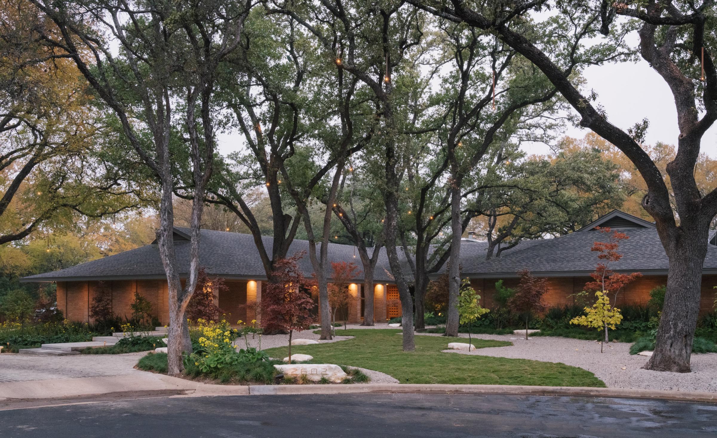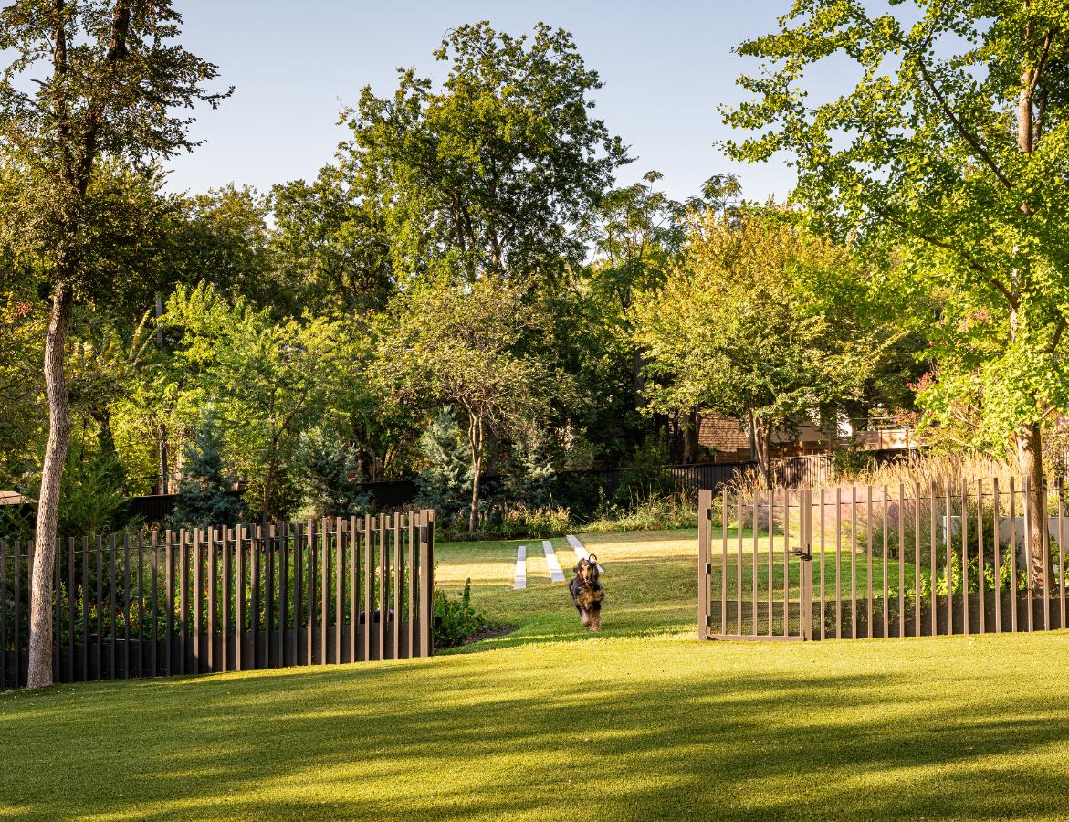 Developed through close collaboration with the architect and homeowners, this urban ranch landscape is organized to support dog training, circulation, and outdoor use within a wooded Texas site. The site-responsive design frames two buildings within a mature woodland, using native plantings, steel retaining walls, and salvaged stone to structure a sequence of outdoor rooms. Curated woodland gardens transition to larger training and gathering spaces, including a puppy garden with terraced lawn and a fire garden. Grading, terracing, and fencing organize movement and access, while seasonal change and material durability define a resilient, adaptable landscape.