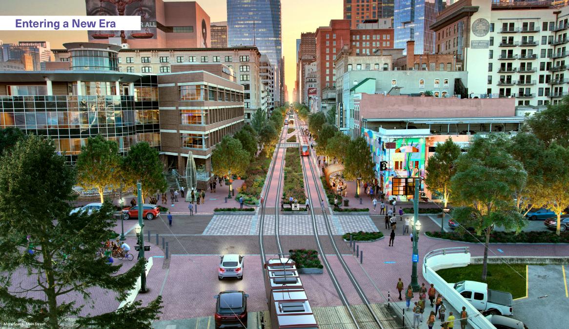More Space: Main Street began as a temporary road closure that evolved into a permanent, stakeholder-supported public realm transformation. The project united public agencies, businesses, property owners, and community members to reimagine a critical downtown corridor. By reclaiming a vehicle-dominated street as a pedestrian-focused civic space, the project elevated and prioritized safety, economic vitality, accessibility, and climate comfort. Integrating historic and cultural identity with modern, multimodal, climate-responsive-infrastructure, the Main Street promenade established a replicable foundation for long-term stewardship, inclusive activation, civic identity, and sustainable growth at the heart of downtown Houston.
