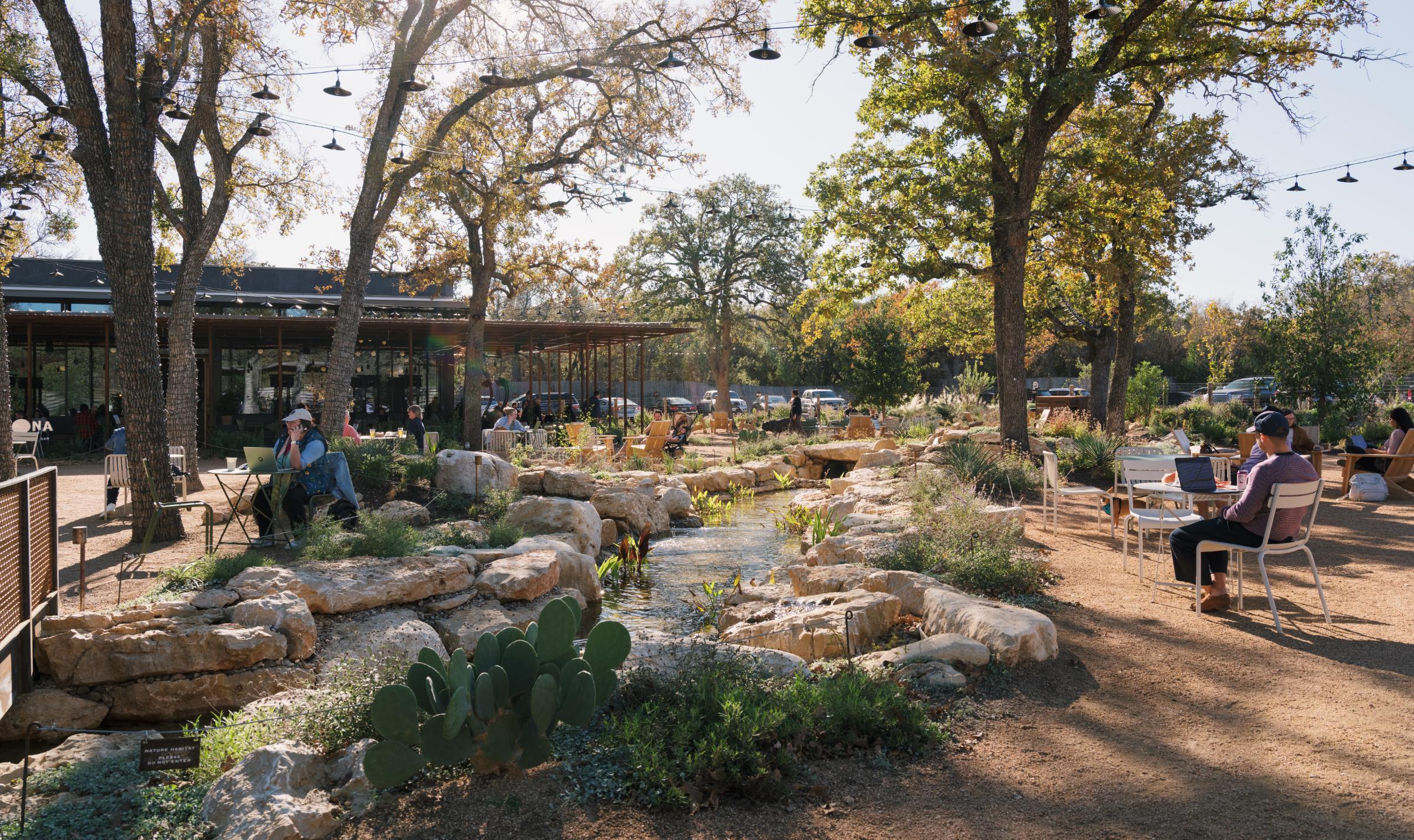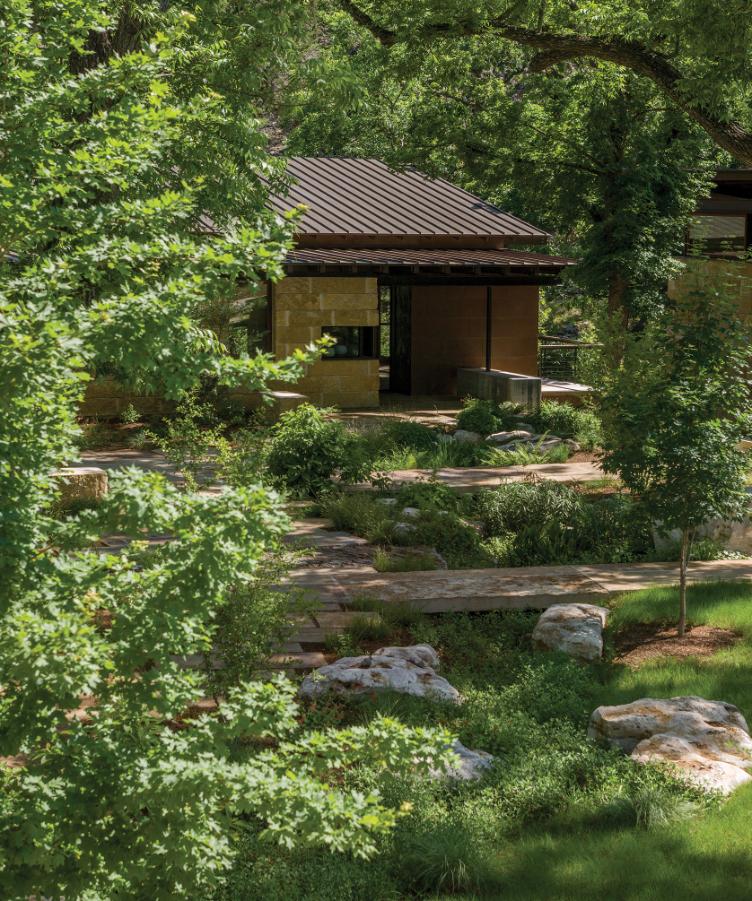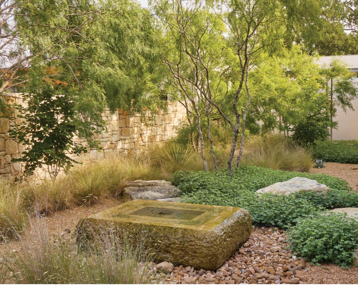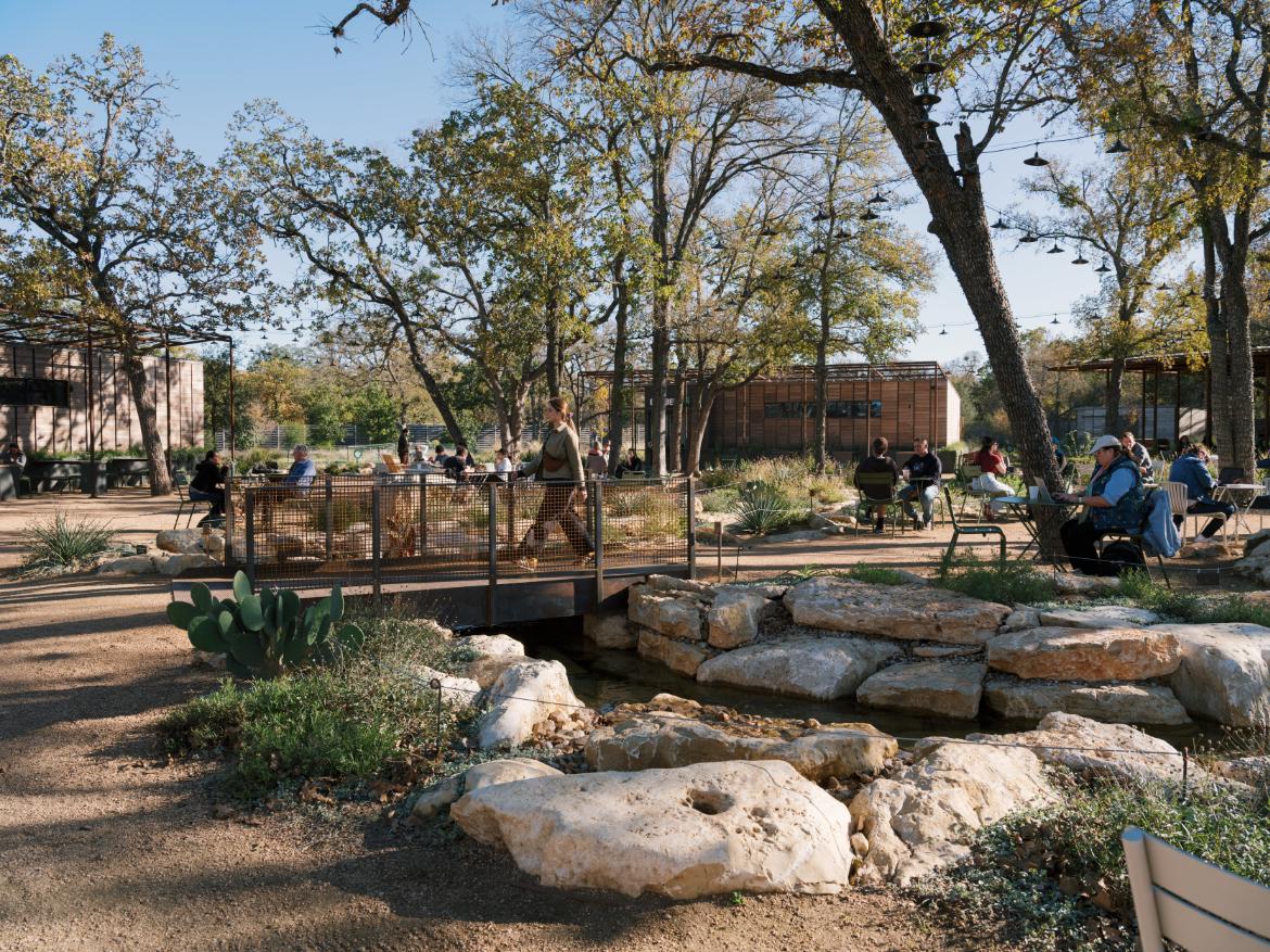 Botanical Cafe transforms an underutilized Sunset Valley site into a hyperlocal botanical destination rooted in ecological stewardship, sensory experience, and community connection. More than 90 mature trees were preserved, with 75 additional trees planted and 19,000 square feet conserved as native habitat. Over 7,000 native and adapted plants support biodiversity, pollinators, and seasonal change. Integrated Low Impact Development strategies, including a detention basin, recirculating water-quality stream, irrigation field, and cistern, create a closedloop water system. Reclaimed limestone, custom site elements, Dark Sky lighting, and edible plantings seamlessly connect landscape, culture, and cuisine.