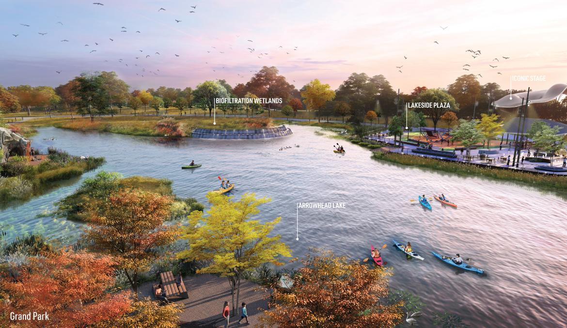 Grand Park reimagines 320 acres of ecologically diverse land, transforming Frisco’s most strategic remaining open space into a regional destination where recreation and natural systems are inseparably linked. Civic Park, the 40-acre first phase, serves as the park’s primary gateway, introducing a living, biofiltered recreational lake, an iconic performance stage, and multi-generational gathering spaces that invite exploration, discovery, play, and connection while establishing a resilient framework that marries civic life with ecological function.