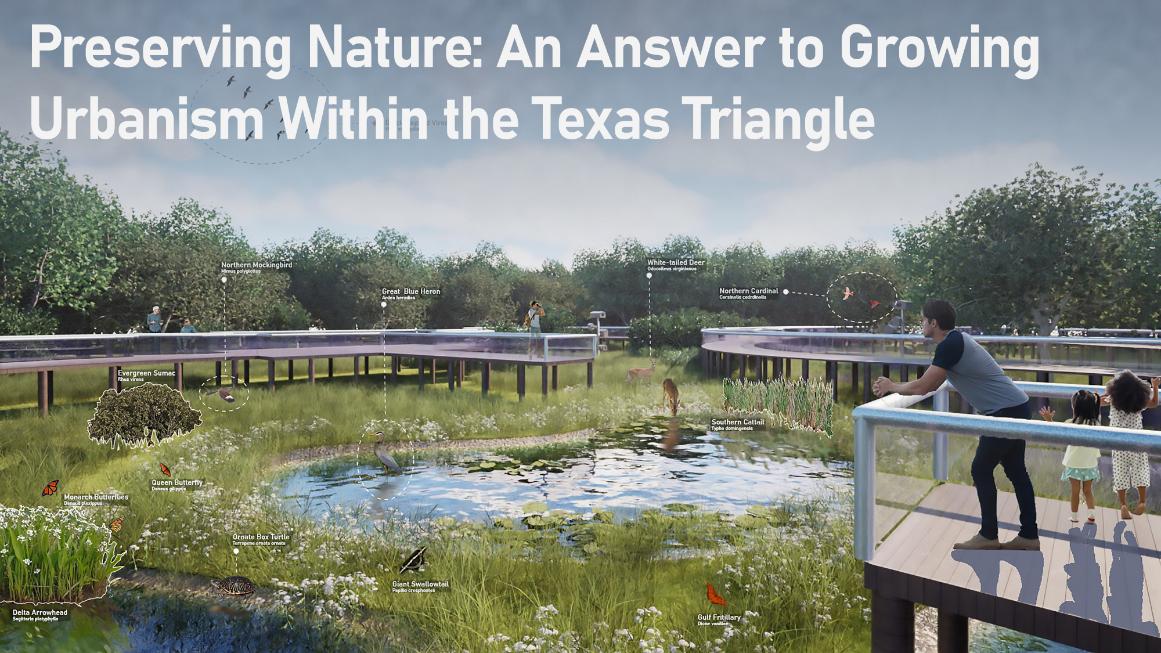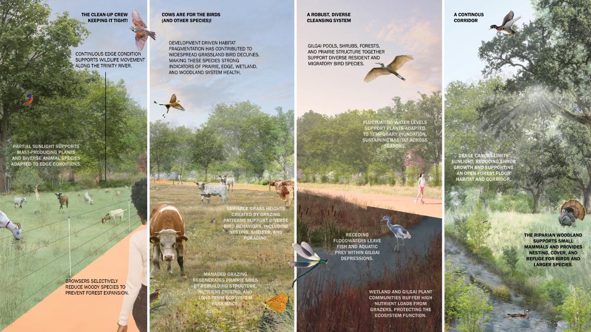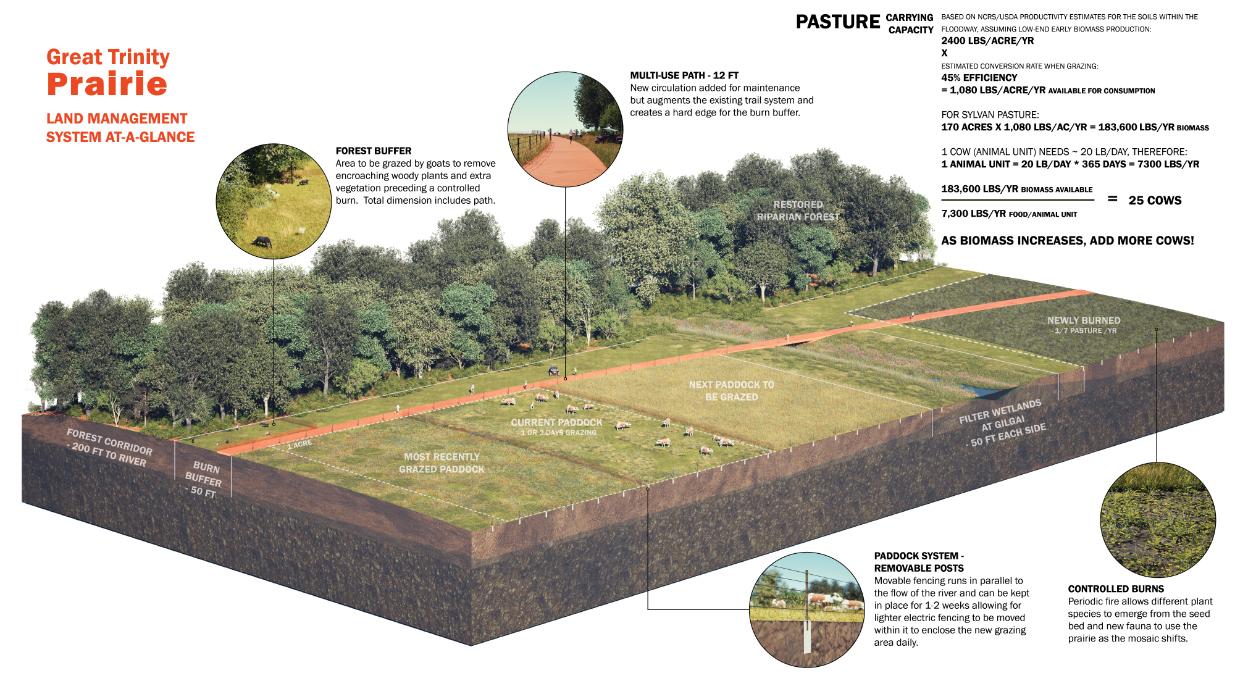 The Great Trinity Prairie is a vision for Dallas that recreates historic management regimes of the Blackland Prairie to reconnect the city to the river by leveraging its cultural identity to increase biodiversity and habitat connectivity while addressing the flood conveyance concerns. The proposal is a framework based on contemporary land management practices that simulate historic disturbance mechanisms of the Blackland Prairie to provide access to nature for historically underserved neighborhoods within Dallas and remind people that the community and culture of North Texas are integrally connected to this critically threatened ecosystem.
