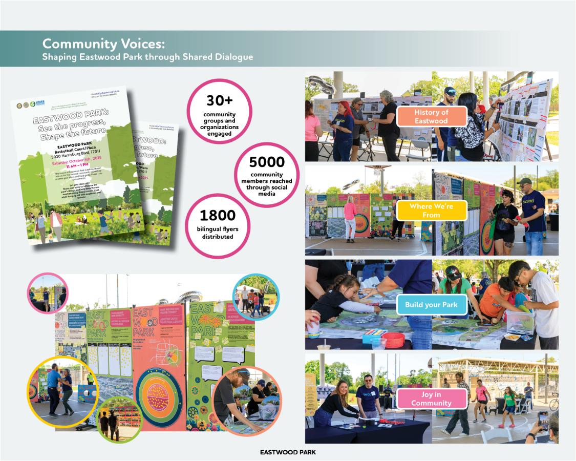 Eastwood Park transforms infrastructure-adjacent land into civic ground for Houston’s East End. The 9-acre neighborhood park, bordered by active freight rail and light rail corridors, serves a predominantly Latino, historically under-served community. Rather than screening infrastructure, the design embraces visibility and movement to connect community life with its urban context. Community listening shaped program priorities, including an expanded skate park, culturally expressive basketball court, accessible playground, and flexible athletic fields. The 540-foot Timeline Boulevard anchors the park with engraved text, mosaic paving, and a gathering plaza. Bioswales, on-site cut-and-fill, and native planting support resilient performance.