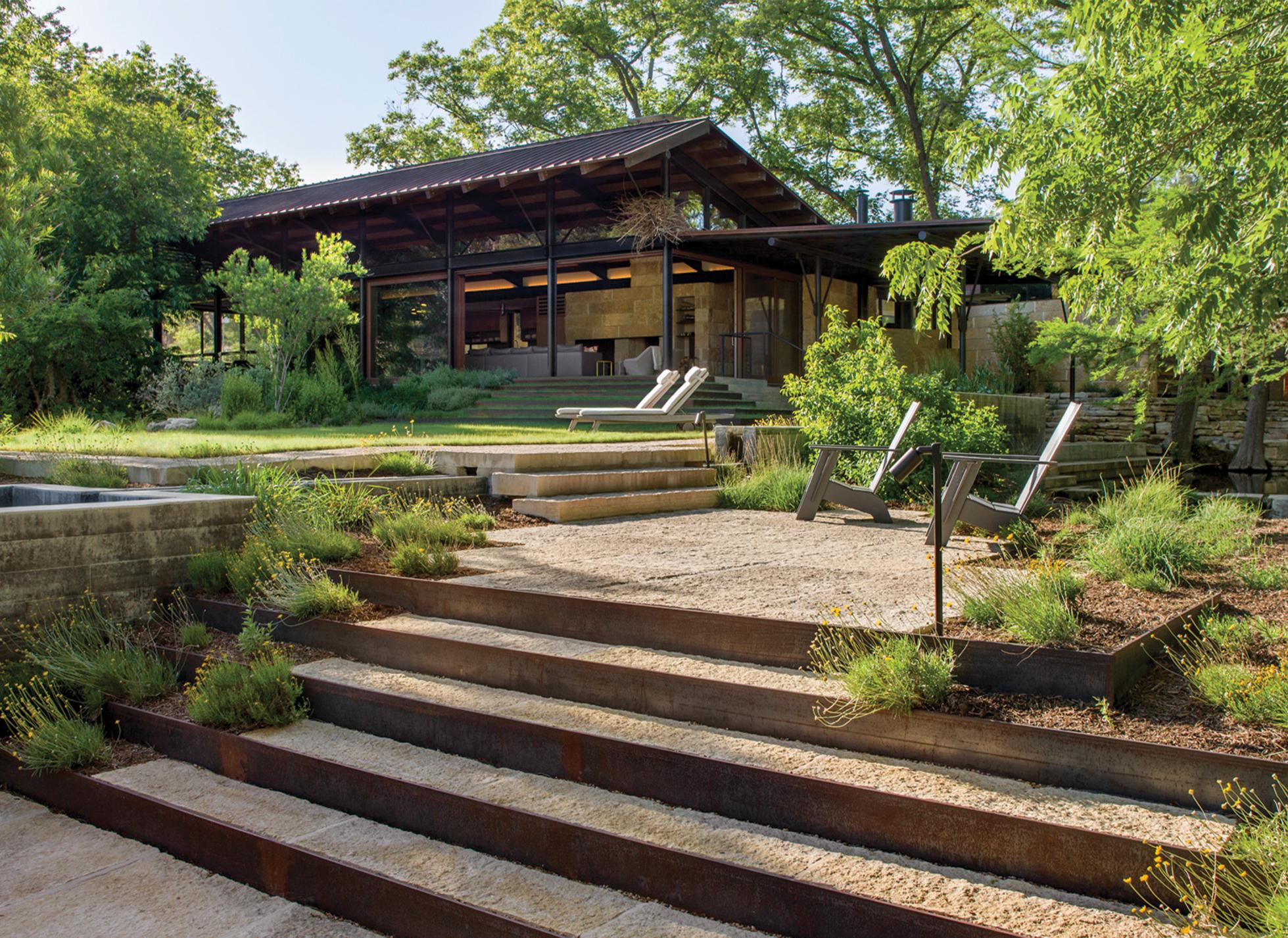 The City Park residence is a 4.2-acre property located in northwest Austin. Sited on a southerly exposed hillside in the Balcones Escarpment, the property has dramatic views overlooking the Pennybacker Bridge and downtown skyline beyond. The landscape design focuses on ensuring the architecture feels anchored in the existing “shelf” where the prior home resided. Native plantings serve to heal disturbed land post construction. A generational residence for the Owner, the exterior spaces provide joy for all age groups. A sense of escape and discovery are instilled whenever you have an opportunity to walk the property.