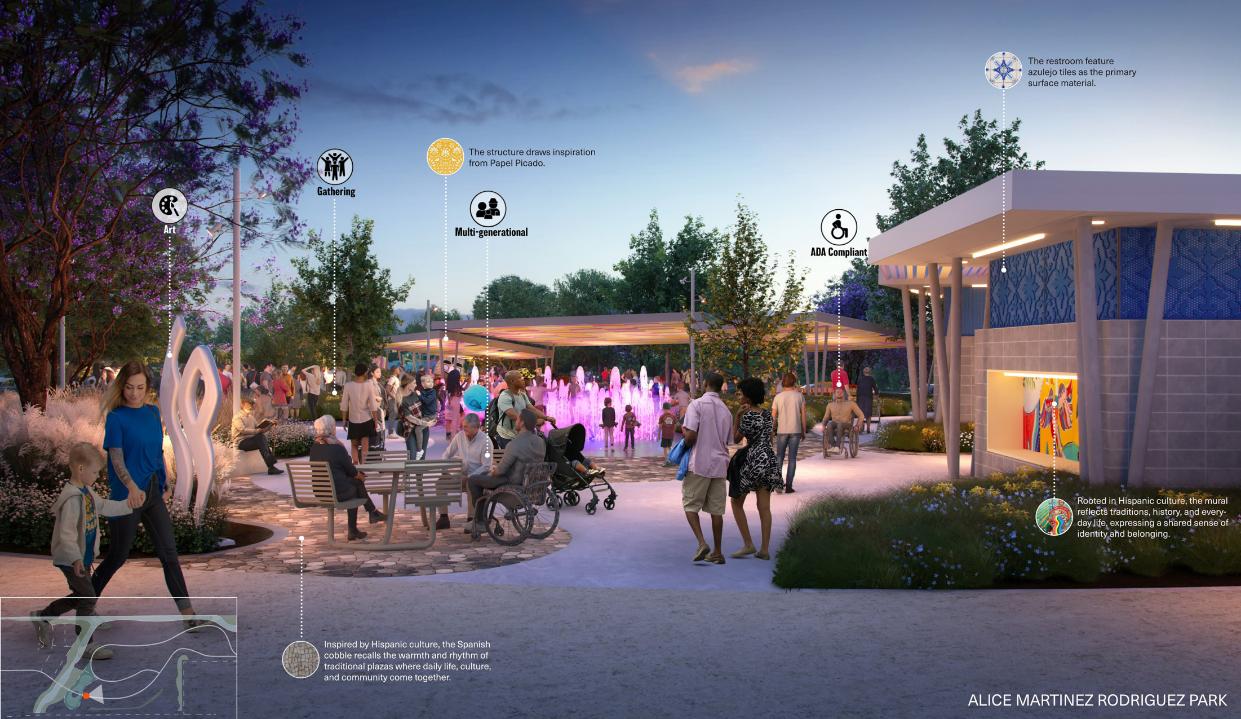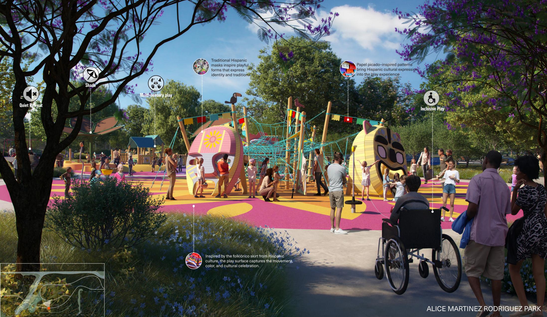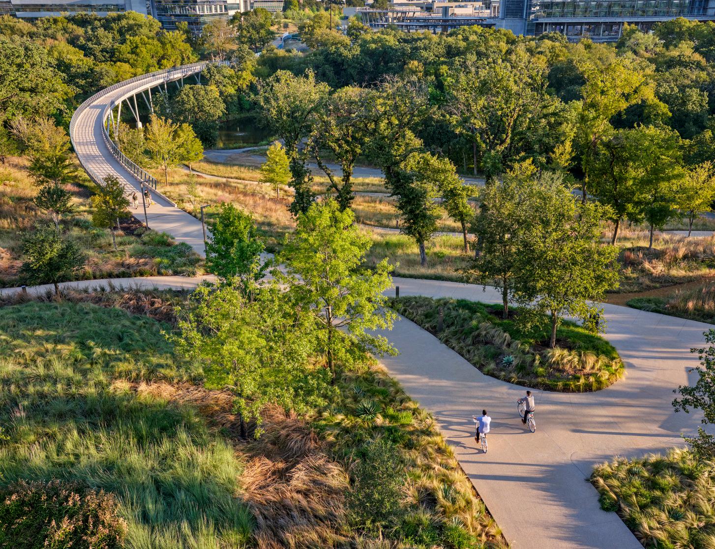 Alice Martinez Rodriguez Park transforms a former stadium site into a culturally affirming and inclusive civic landscape for South Waco. Cultural storytelling and bilingual interpretation anchor the park’s identity, while multi-use trails connect surrounding neighborhoods to Waco’s expanding trail network. Ecological restoration along Waco Creek improves flood resilience and habitat while shaping immersive public spaces. Guided by robust community engagement and collaboration with disability advocates, the park integrates all-abilities play and accessible amenities throughout. The project demonstrates how landscape architecture can elevate cultural visibility, reconnect communities, and create equitable access to nature.
