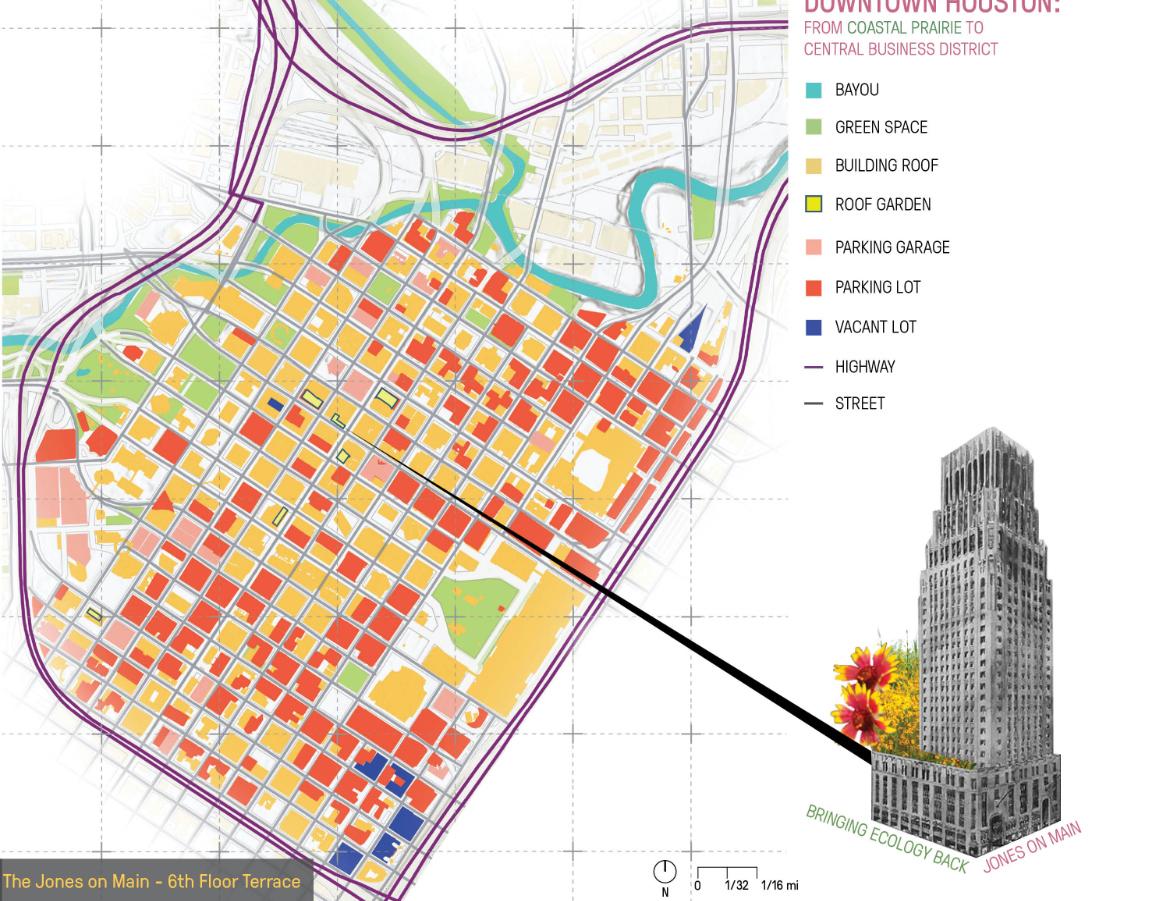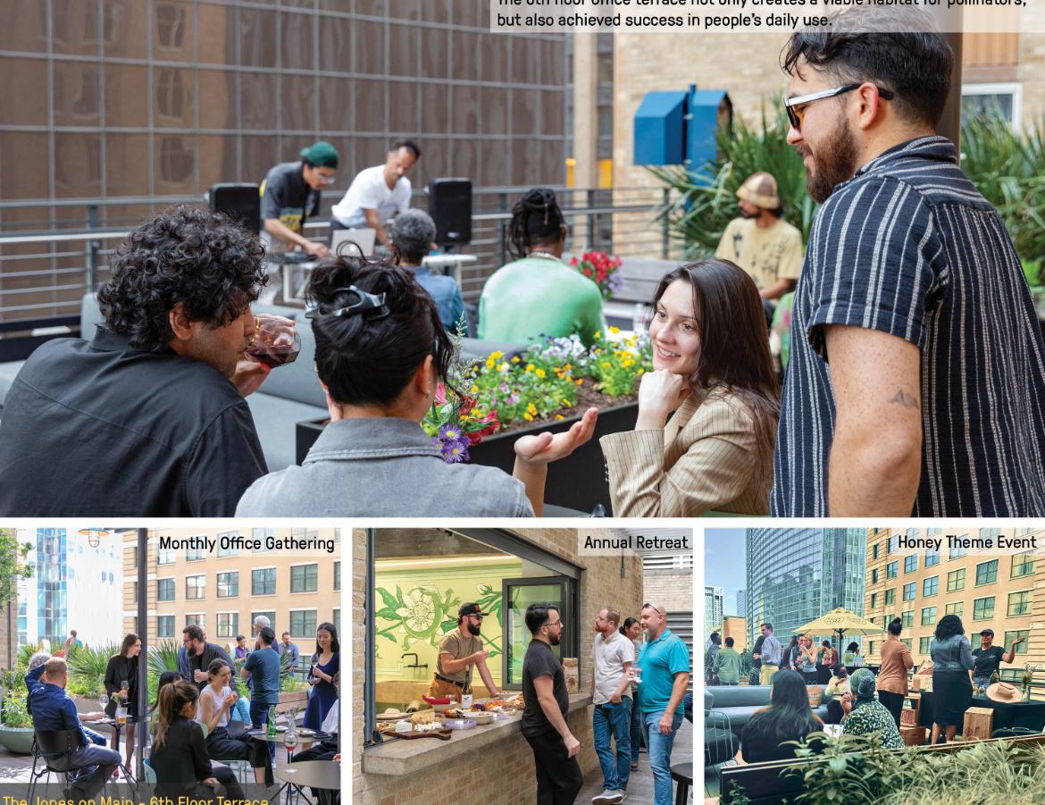 Jones on Main 6th floor terrace retrofit transforms an inaccessible 1929 mechanical roof atop Houston's historic JPMorgan Chase Building into a 3,750-square-foot rooftop terrace serving the entire building community. Through innovative structural engineering that distributes loads without compromising the Art Deco landmark's integrity, the design creates a floating superstructure above the original roof. Plantings adapted to extreme microclimate conditions, active beehives integrated with ground-floor food operations, and flexible gathering spaces establish urban habitat while fostering daily tenant connection.