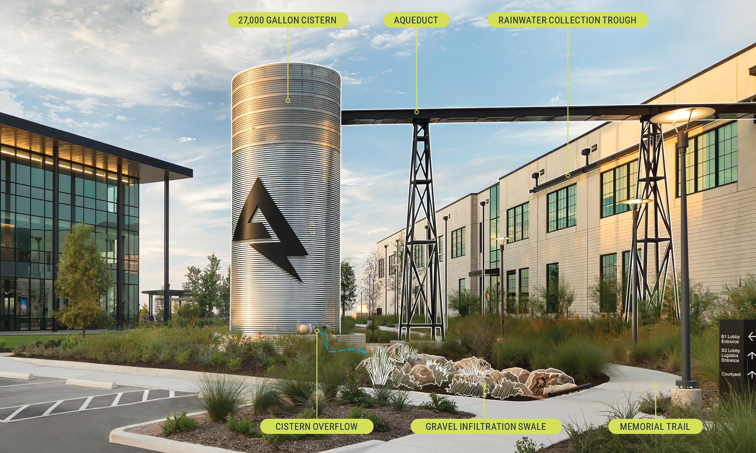 The landscape of a new 20-acre corporate/manufacturing campus foregrounds rainwater harvesting and the beauty of the native Blackland Prairie landscape in a high visibility freeway frontage context. The master plan integrates site amenities for events and gatherings in a central hub, and for exercise in a campus trail, supporting employee wellbeing. It also allows for future expansion. The design team cast the industrial materials of the hardscape and buildings in strong contrast against the loose character of native plantings and the ruggedness of regional stone, giving the campus a dramatic look.