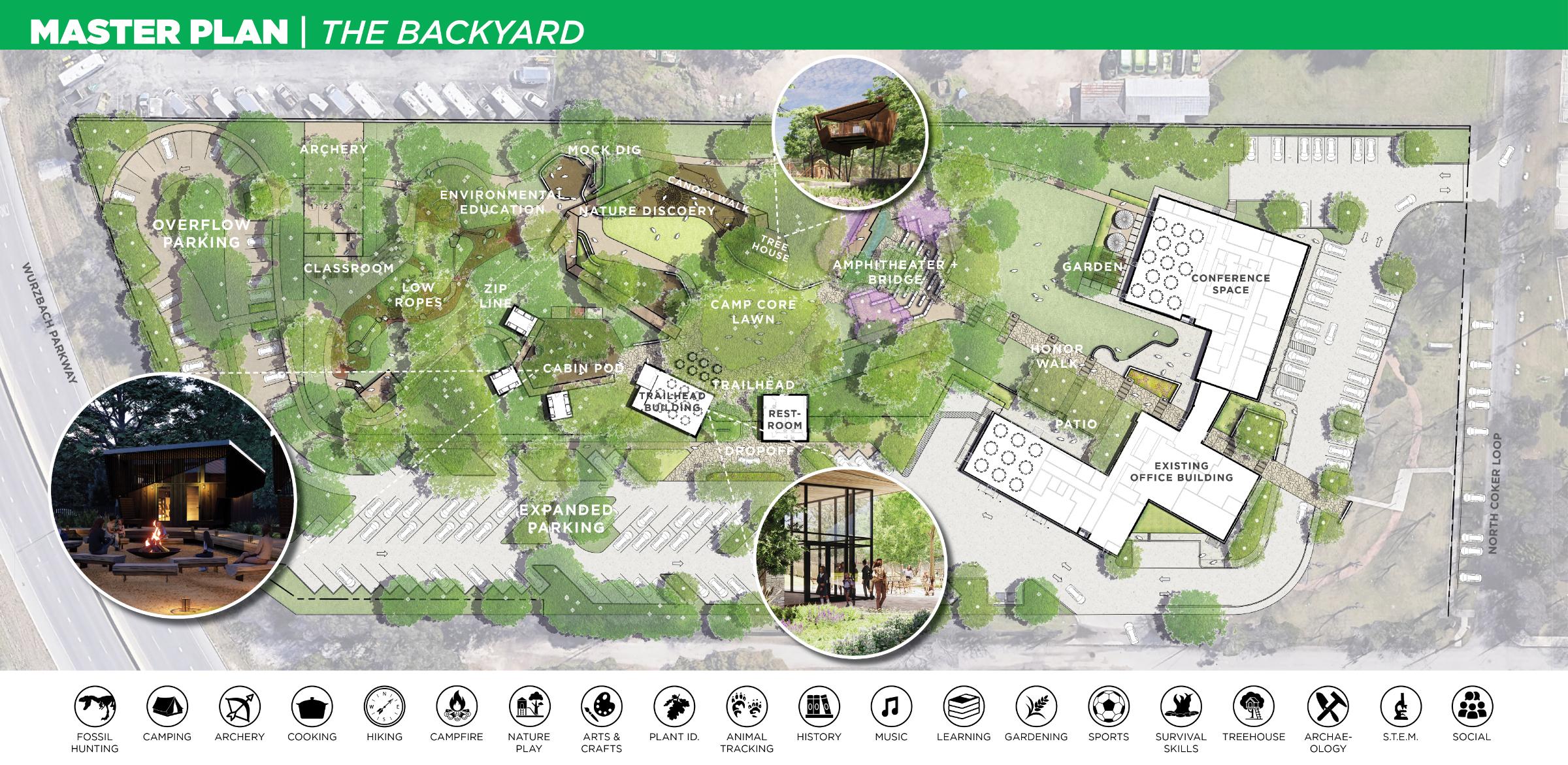 The master plan of the nearly 7-acre corporate campus of Girls Scouts of Southwest Texas reveals a new dual use of its headquarters as an immersive mini-camp. A central campfire recognizes the history of Mira Sol, the first resident camp for Black Girl Scouts in Texas. New multi-purpose ‘trailhead’ buildings and cabins support both donor events and overnight camping for troops within an urban natural setting. Nestled under heritage oaks, programming centered around archery, archaeology, and a ropes course gives a foretaste of the broader portfolio of experiences at “big camp” in the Hill Country.