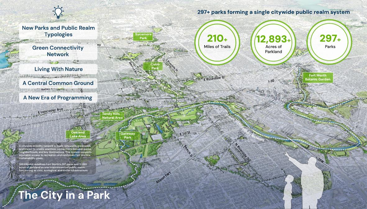 GREENprint Fort Worth charts a bold transformation of a fastgrowing city into a “City within a Park,” where daily life unfolds within a connected public landscape. Moving beyond traditional park boundaries and a traditional parks system master plan, the plan weaves nature, streets, waterways, and civic spaces into a continuous public realm that shapes how residents move, gather, and thrive. Through data-informed strategy and community co-authorship, GREENprint reimagines everyday places—neighborhood streets, corridors, and riverfronts—as shared civic assets, creating a living framework where equity, resilience, and public life are embedded into the fabric of the city.