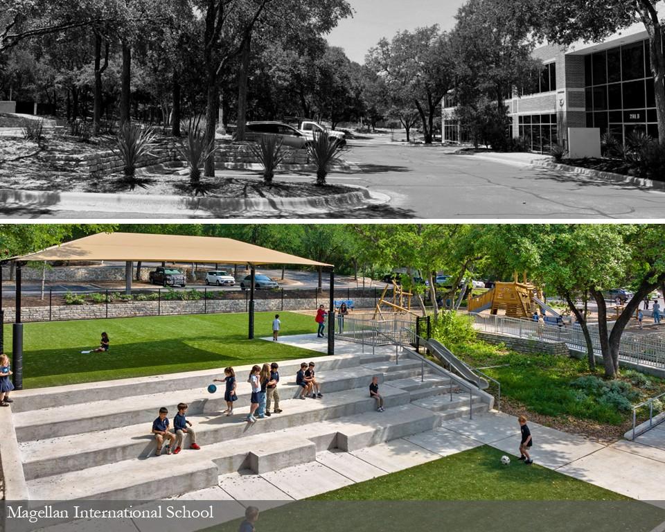 From an office complex to an International Baccalaureate School for K-12th students, the Magellan International School is re-purposing a site to serve the surrounding community in a unique way. The design team transformed an existing asphalt parking lot into an outdoor learning environment that allows for discovery, exploration, play and connection to form a new identity for the school. Playgrounds, various learning spaces, a multi-purpose field for athletics, hard courts for PE and recess enrich the daily curriculum and student experience all guided by a design approach centered on overall student wellness..