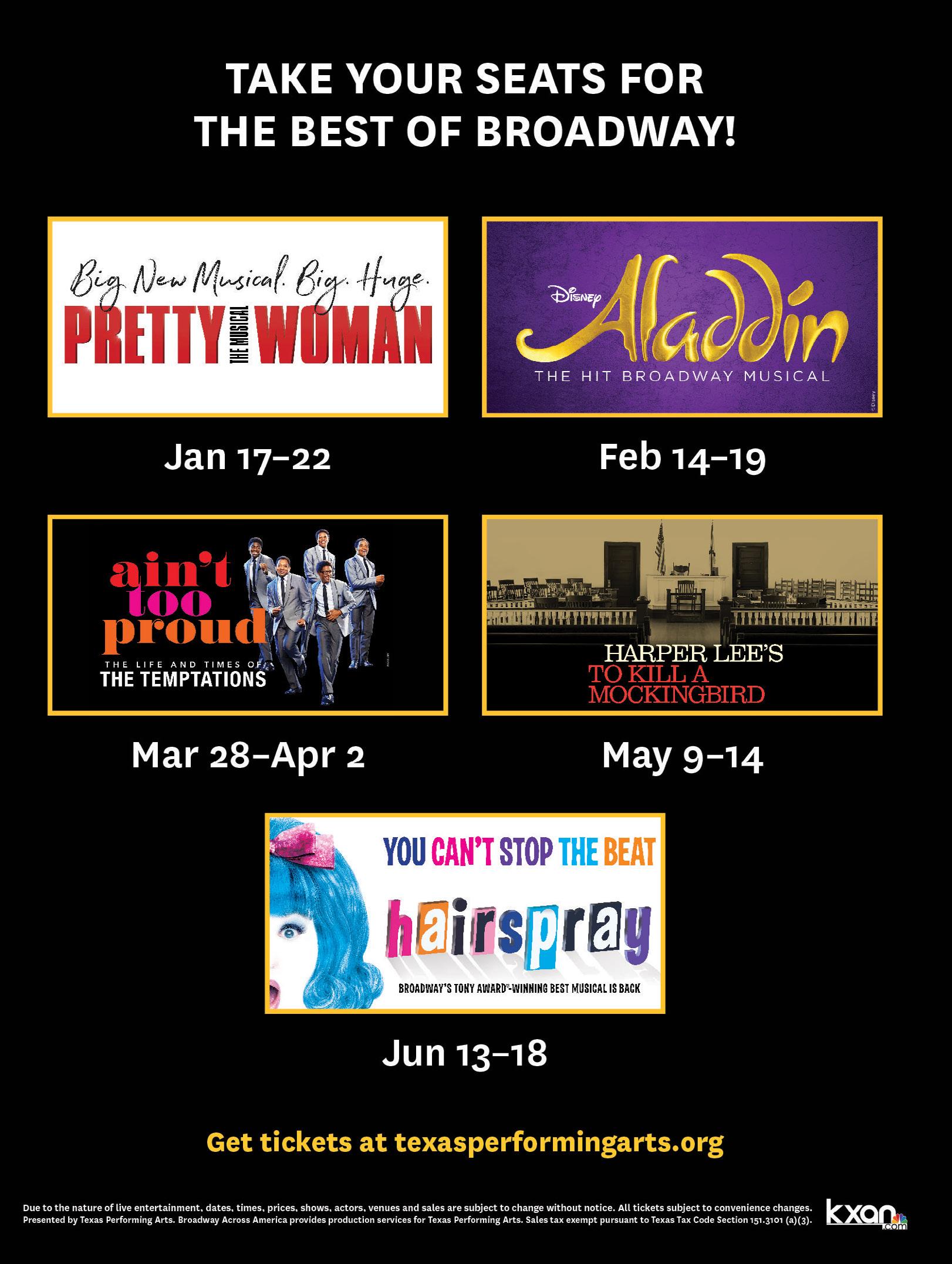 The 2022–23 Broadway in Austin season complements our always-popular Texas Welcomes series of concerts, comedy, and family entertainment. For artistic adventures, our hand-picked 22/23 Texas Performing Arts Season features the latest in live arts from around the world. You can find everything we offer at texasperformingarts.org. We hope you can join us for another performance soon. Enjoy the show!