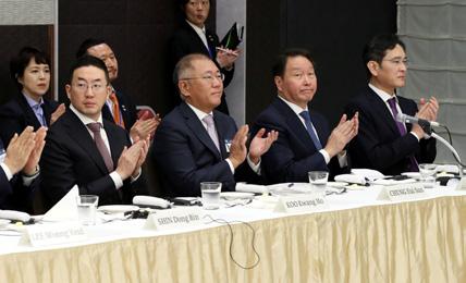 3월17일 도쿄 게이단렌 회관에서 열린 한일 비즈니스 라운드테이블에 참석한 총수들 모습. 왼쪽부터 구광모 LG그룹 회장, 정의선 현대자동차그룹 회장, 최태원 SK그룹 회장, 이재용 삼성전자 회장. 2023.7.6.