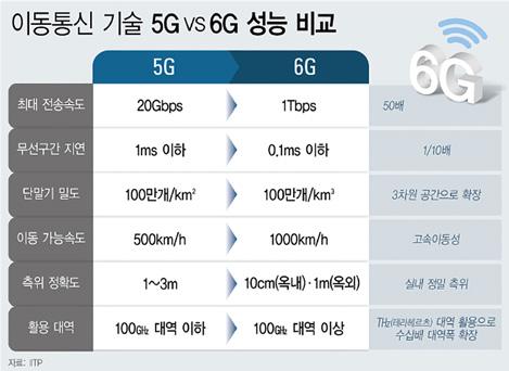 6G는 5G보다 50배 빠른 전송 속도와 10배 빠른 반응 속도, 최대 1000km/h 이동을 지원하는 차세대 이동통신 서비스다.