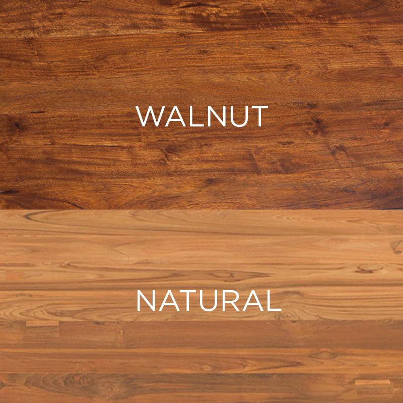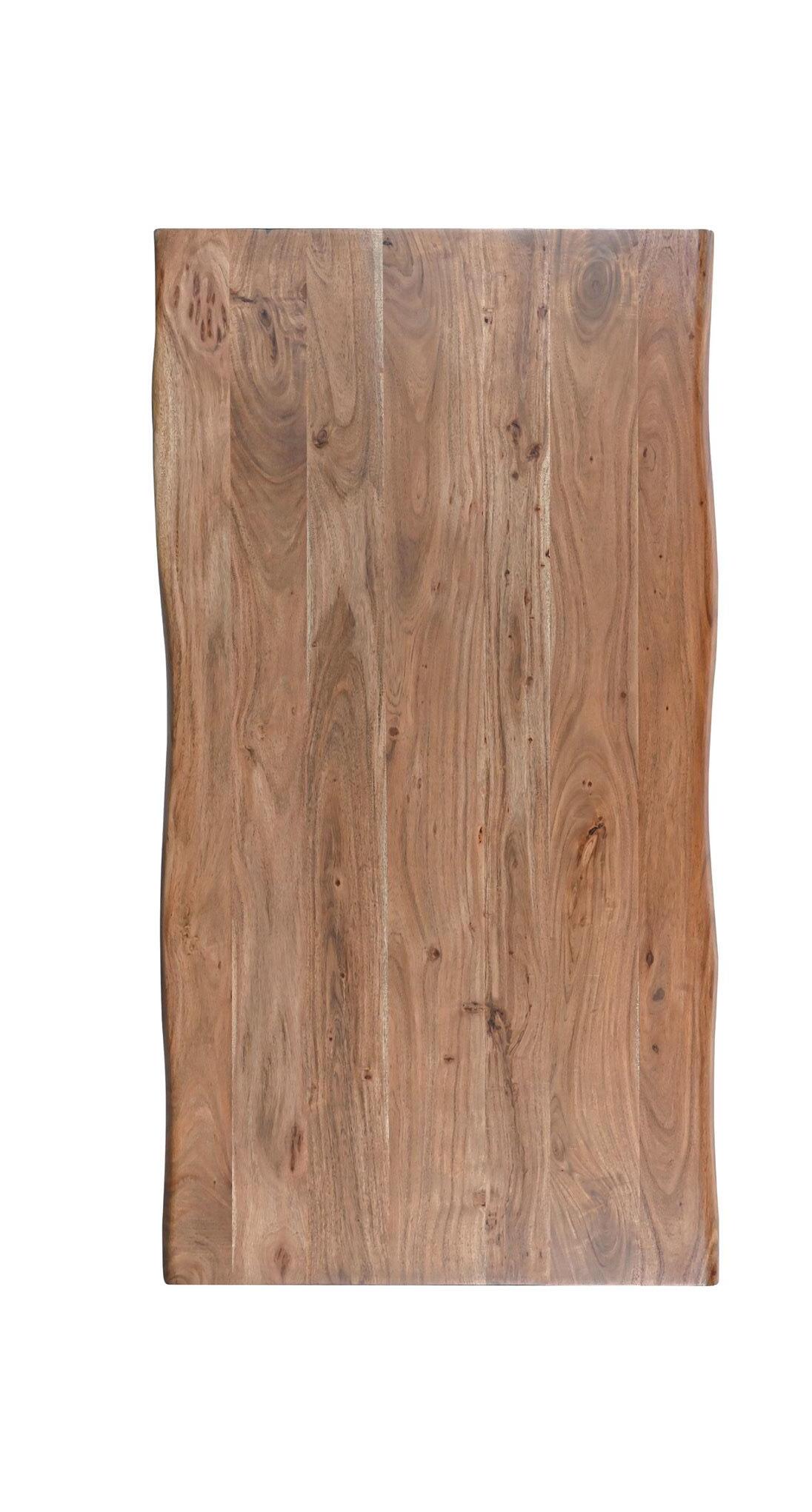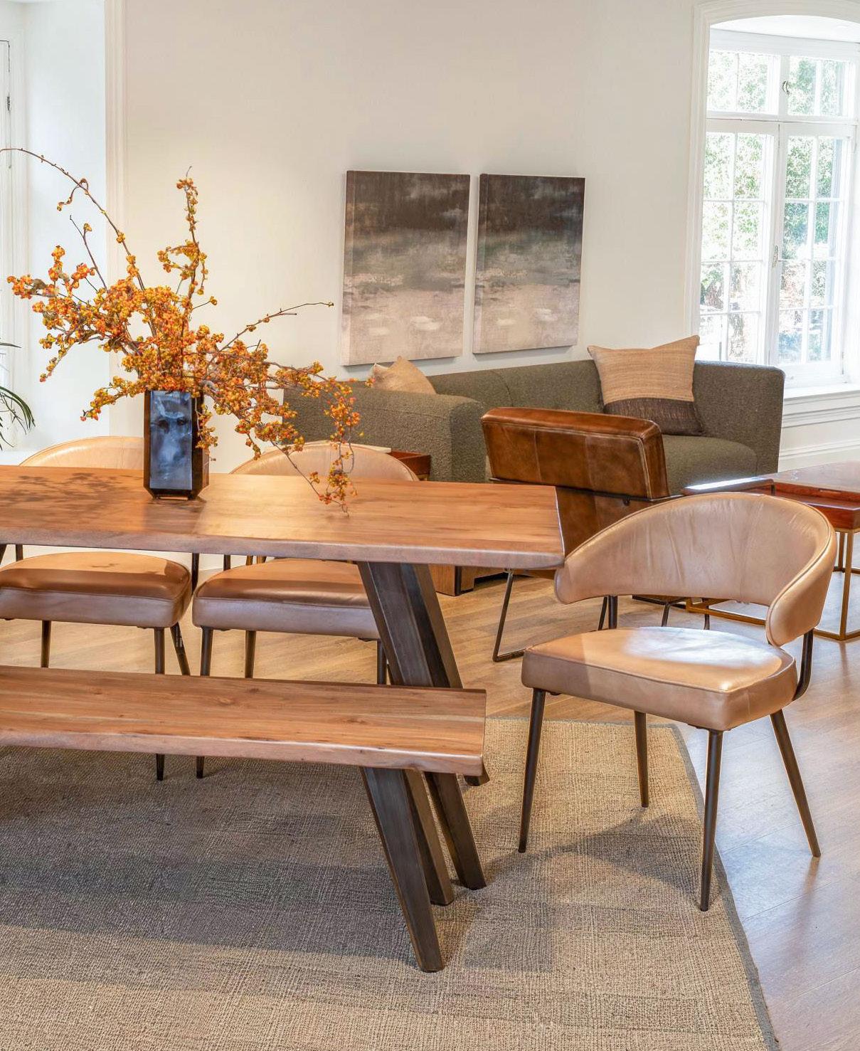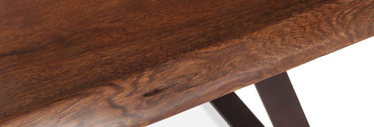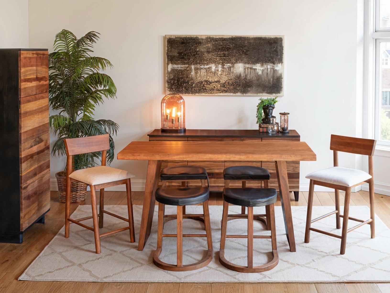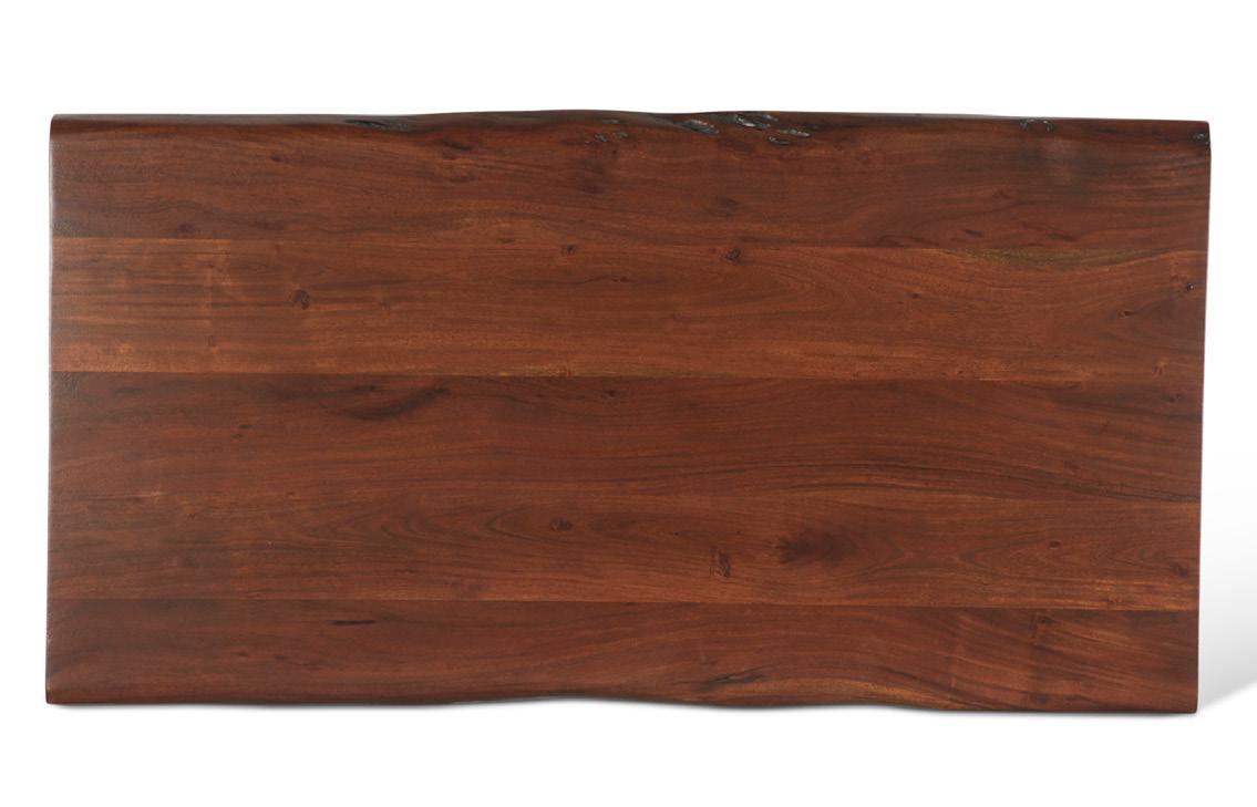 The faux live-edge and deep walnut finish of our Aspen Collection is a warm contrast to their steel bases. Made from solid acacia wood with a water-based eco-friendly finish.