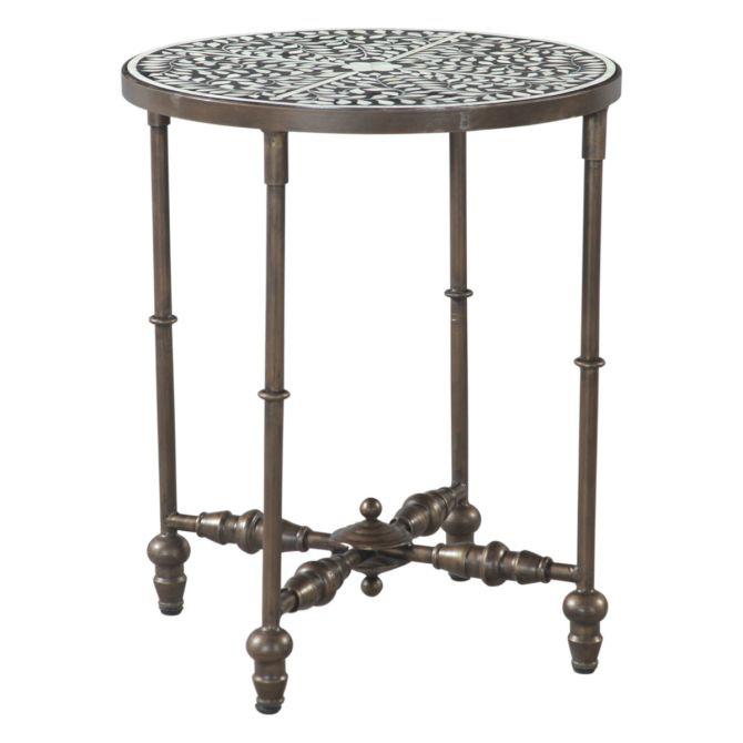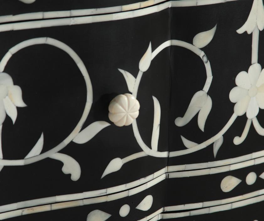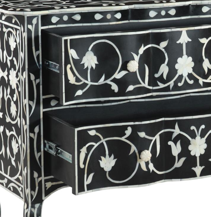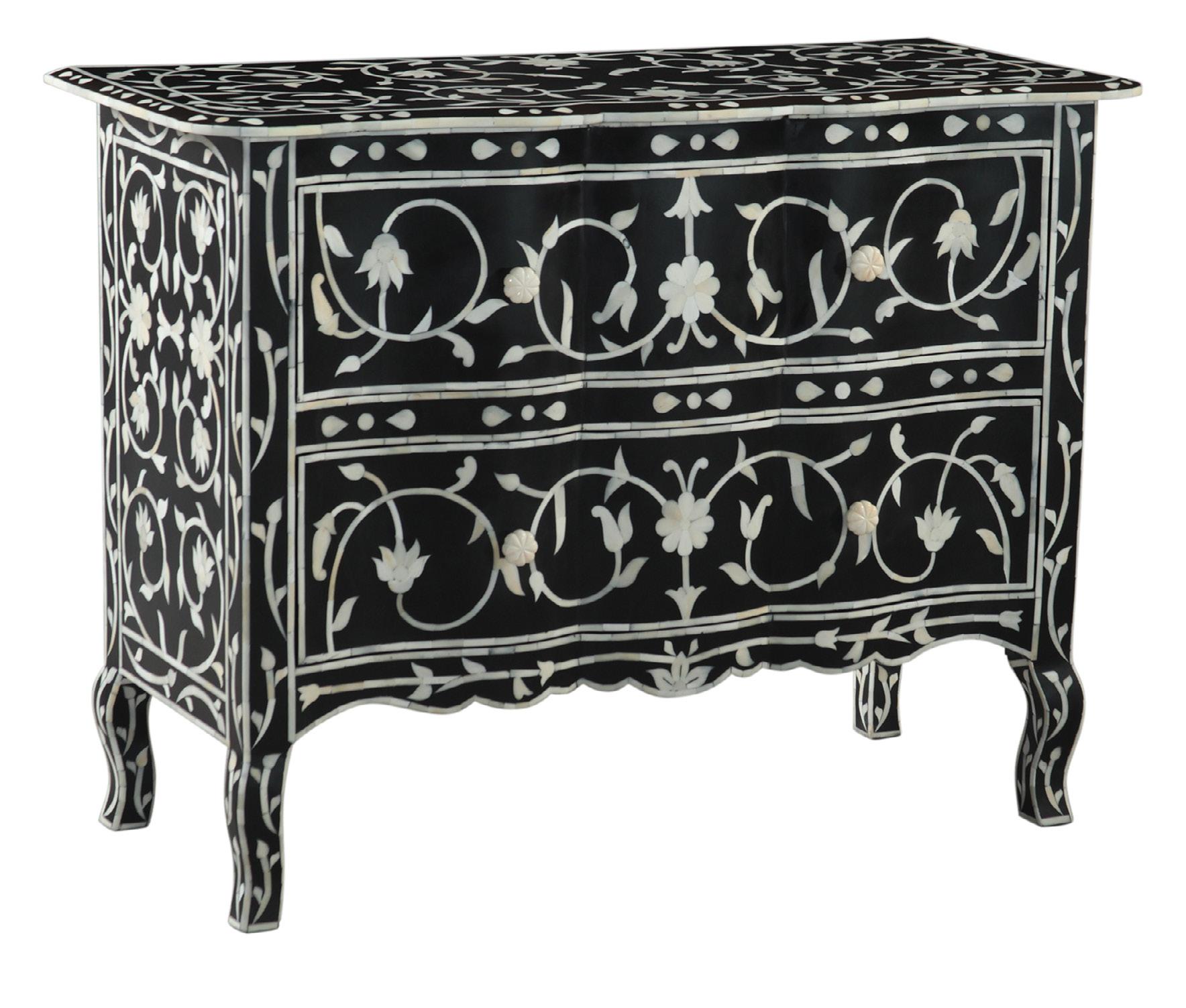 The Fleur 42" Two Drawer Chest features exquisite floral horn inlay on a solid mango wood frame, combining artisanal craftsmanship with functional design. Two spacious drawers offer practical storage, while the unique inlay pattern.