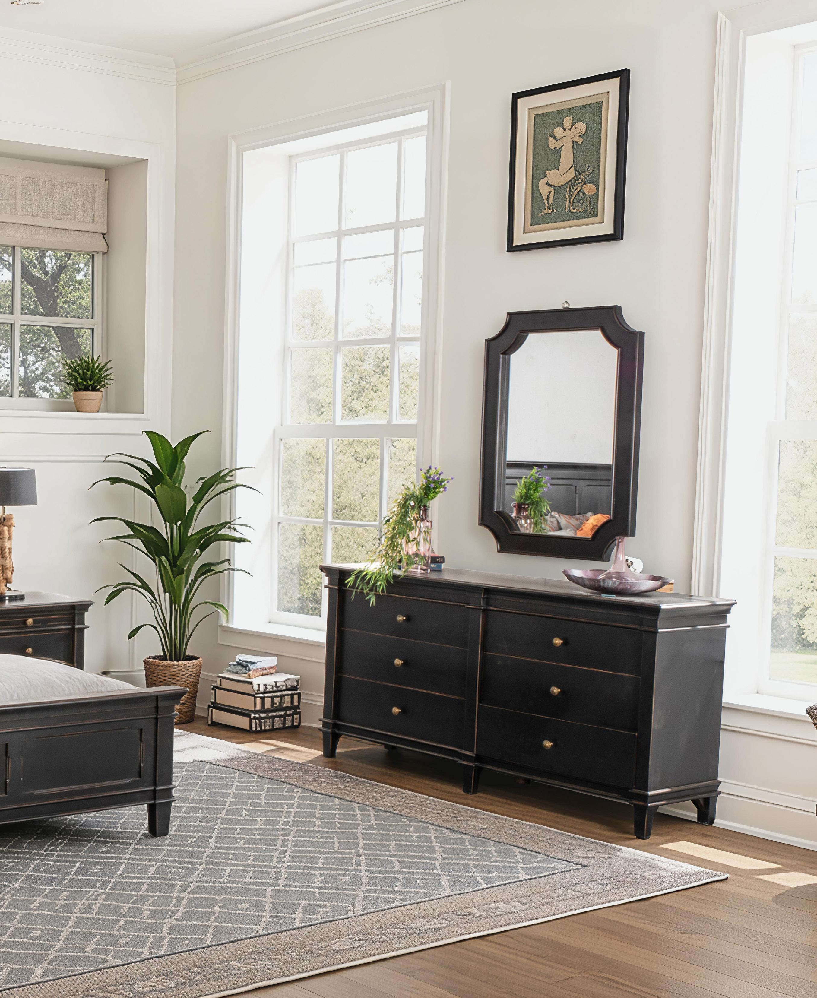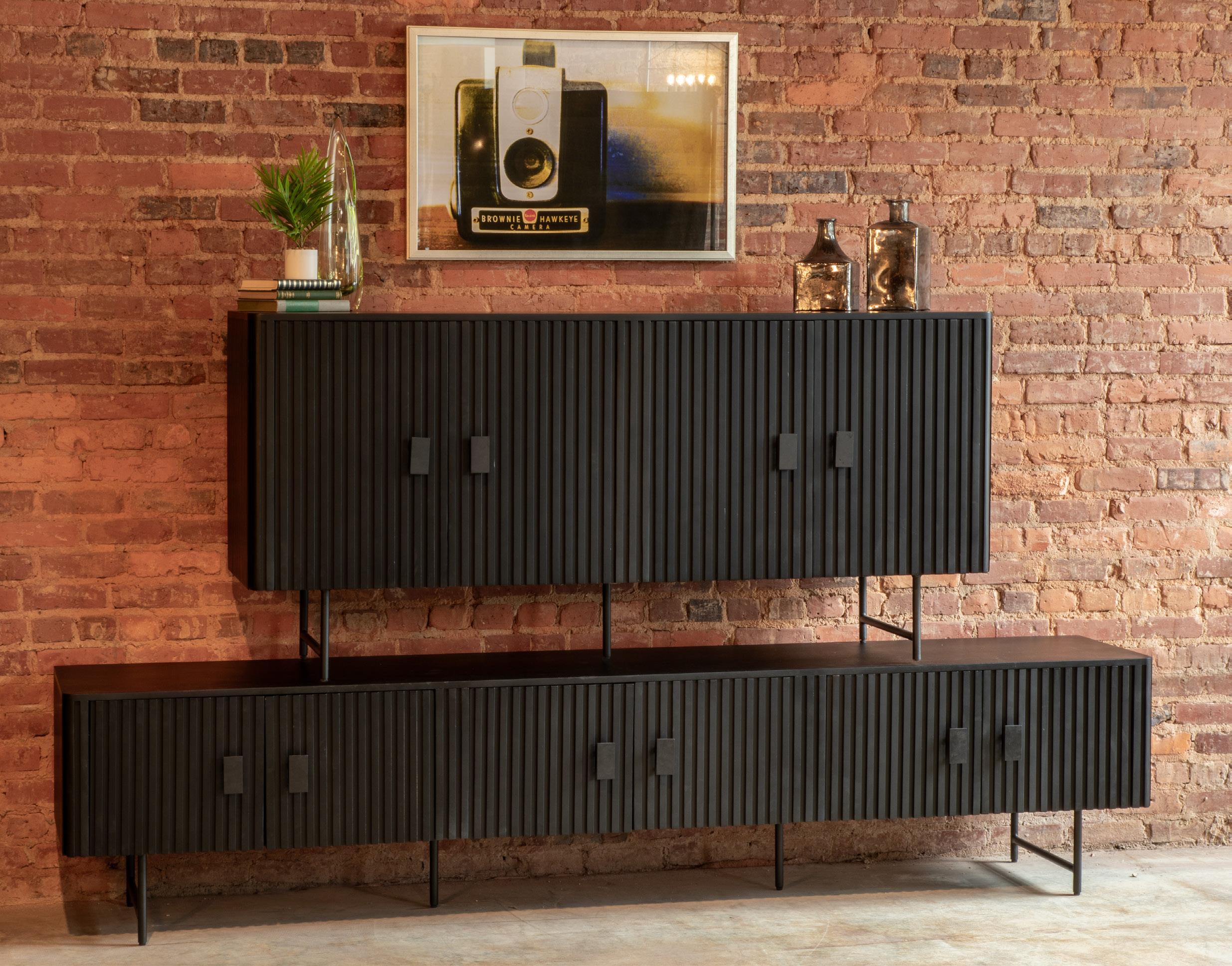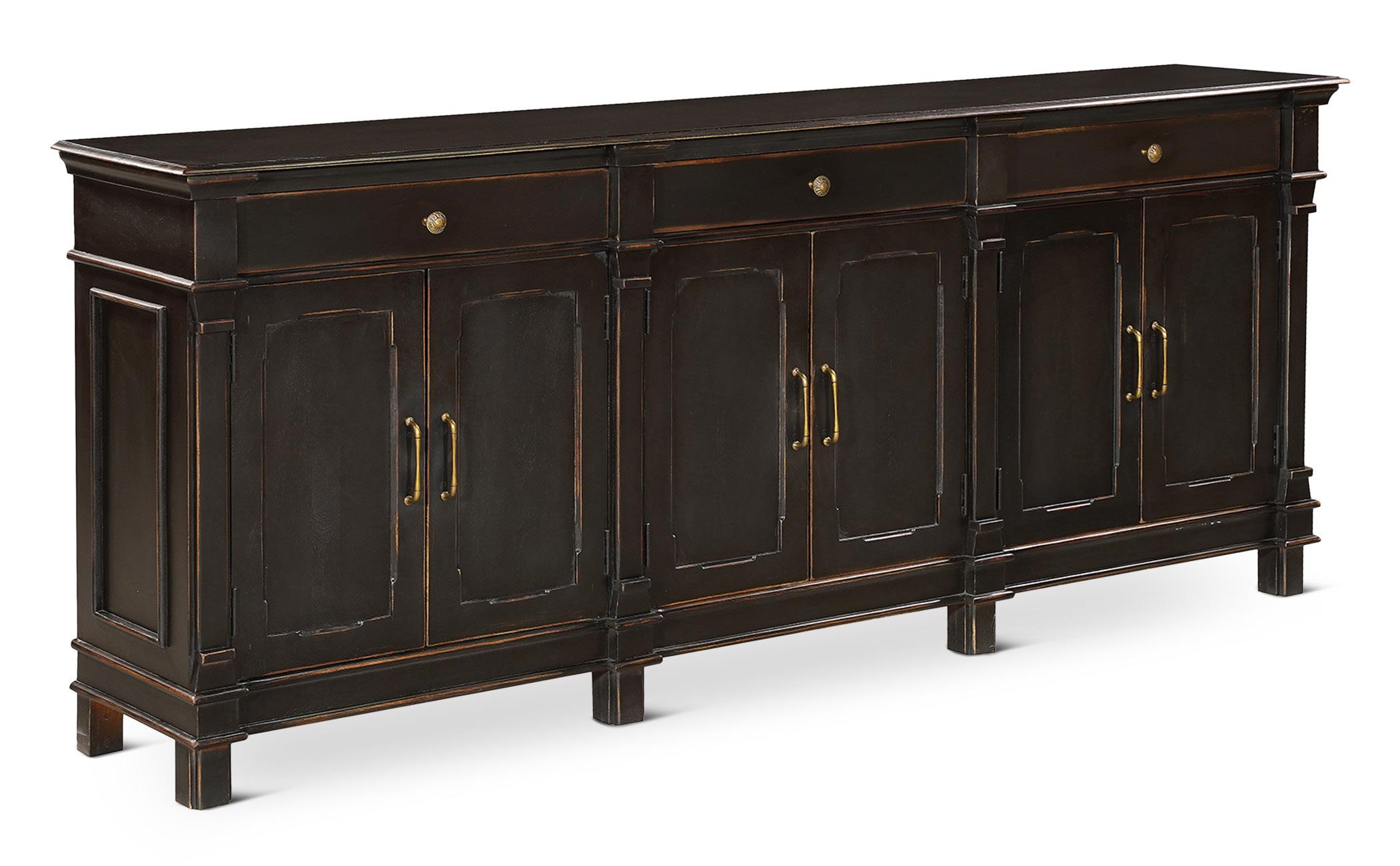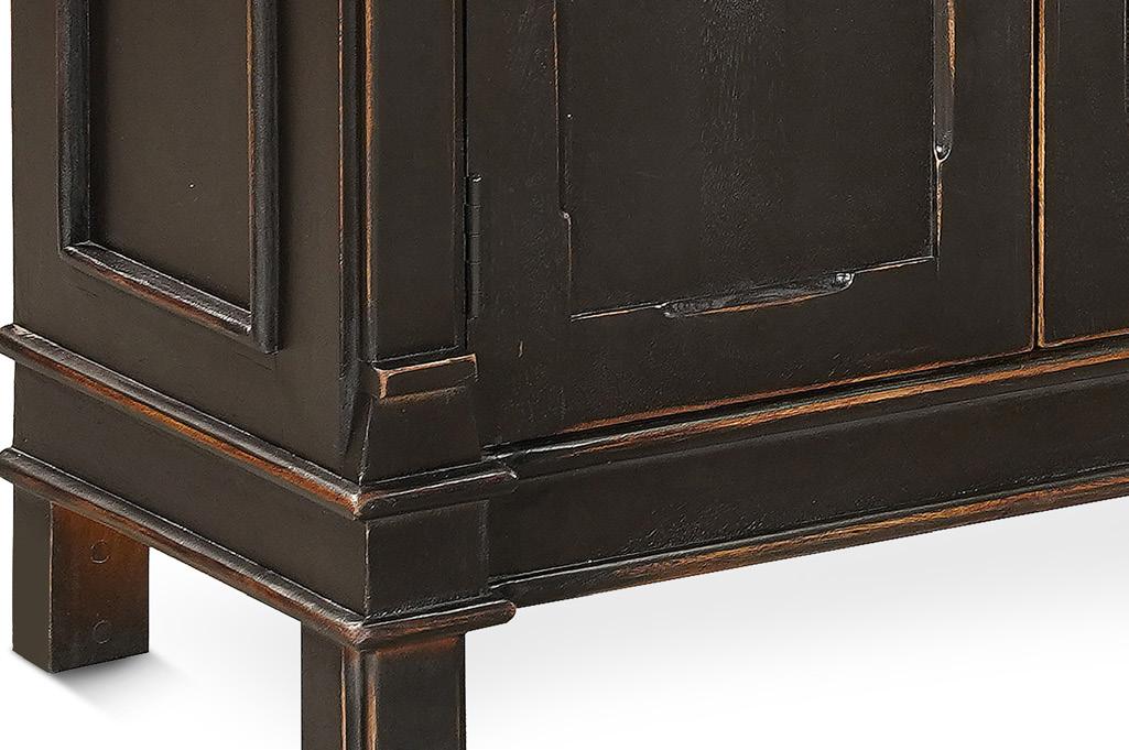 The Turin collection offers a timeless silhouette with a distressed black finish, warm walnutstained interior, and classic gold brass hardware. With generous storage behind paneled doors and traditional detailing, this substantial piece blends elegance and function.