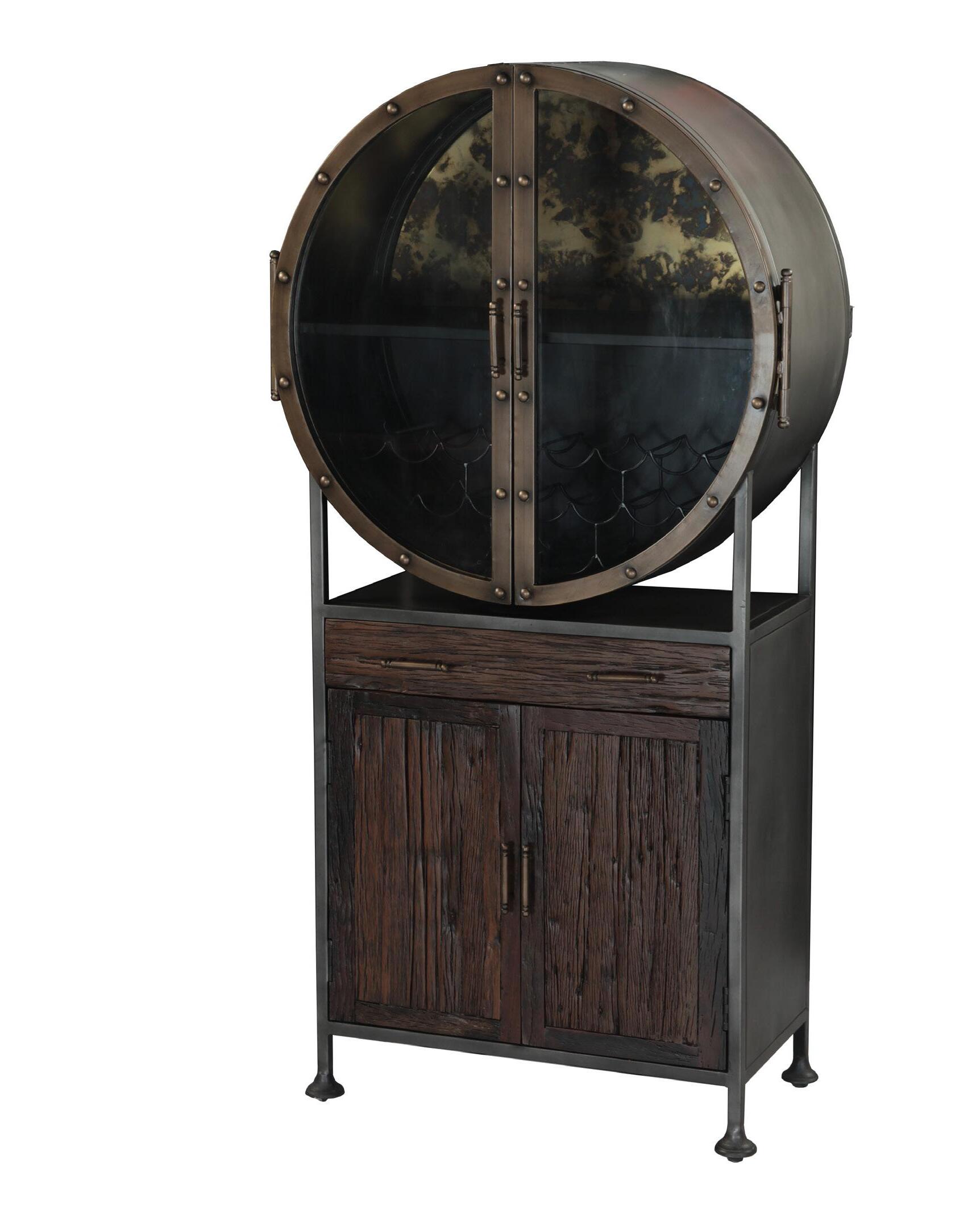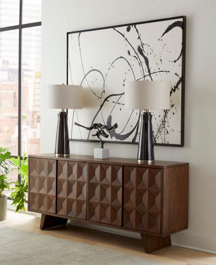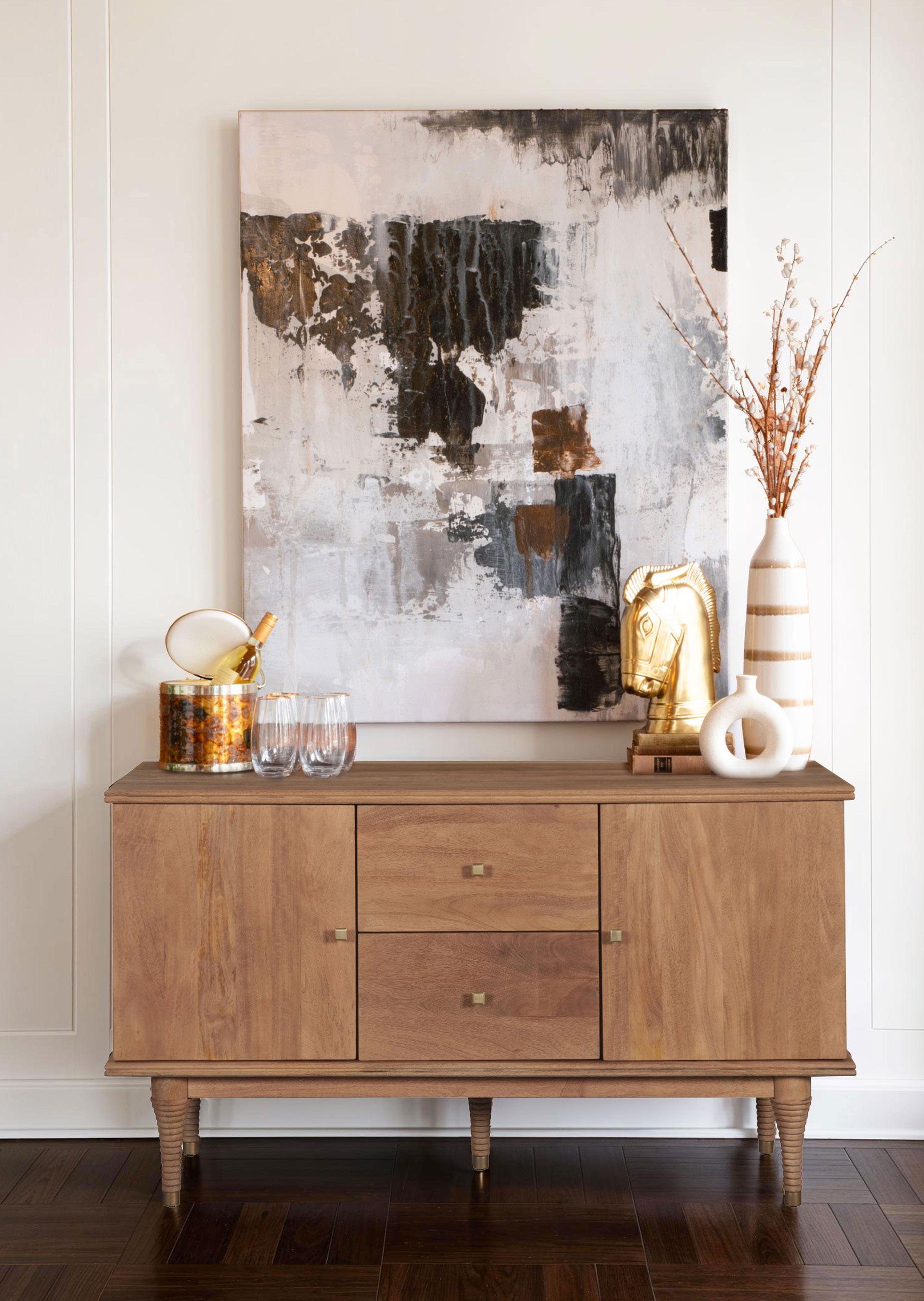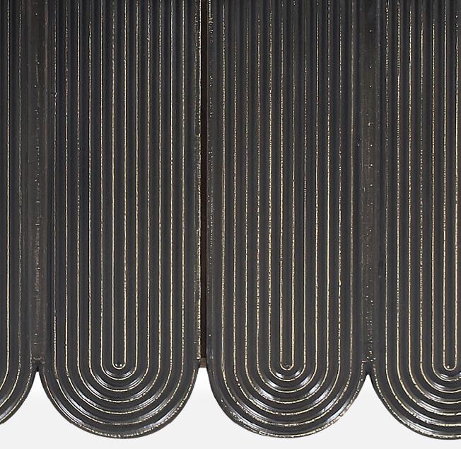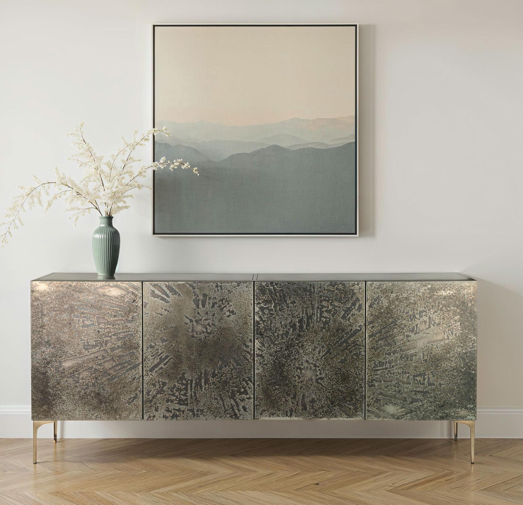 The Turin collection offers a timeless silhouette with a distressed black finish, warm walnutstained interior, and classic gold brass hardware. With generous storage behind paneled doors and traditional detailing, this substantial piece blends elegance and function.