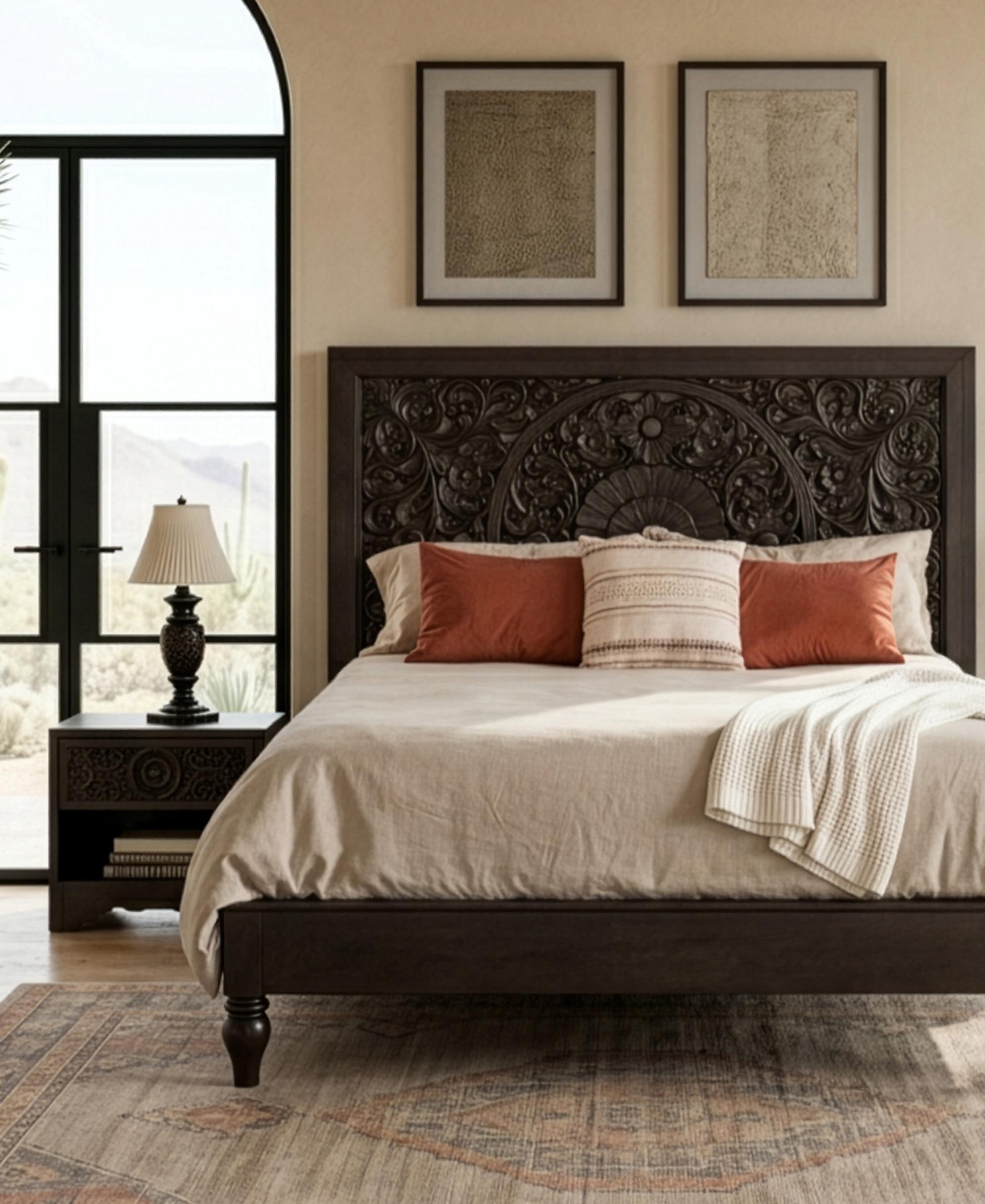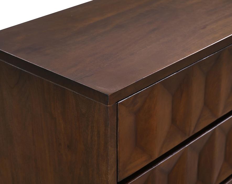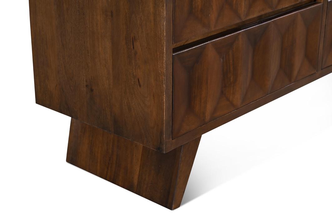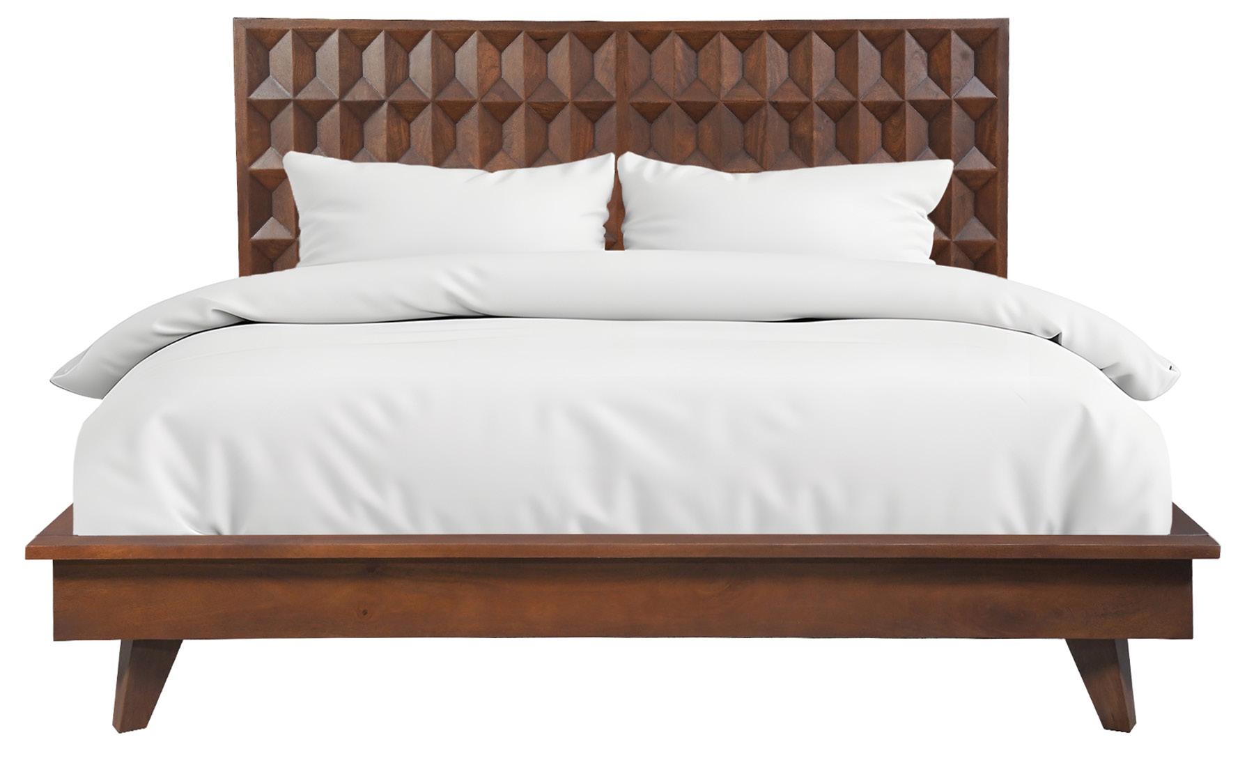 The Palermo Collection showcases a hand-carved geometric pattern, which adds subtle texture and artisanal detail. Finished in a rich royal brown, its solid wood construction combines durability with timeless style, making it a striking centerpiece for any bedroom.