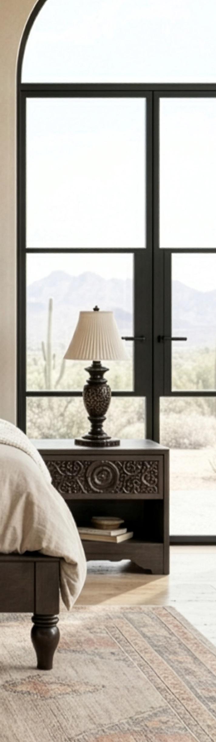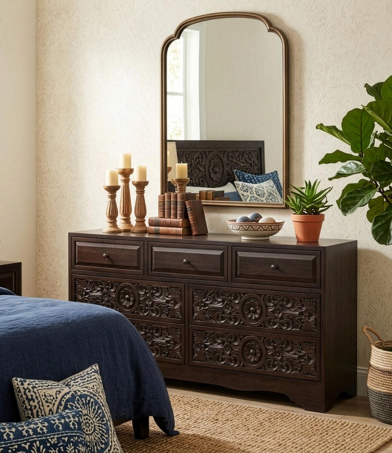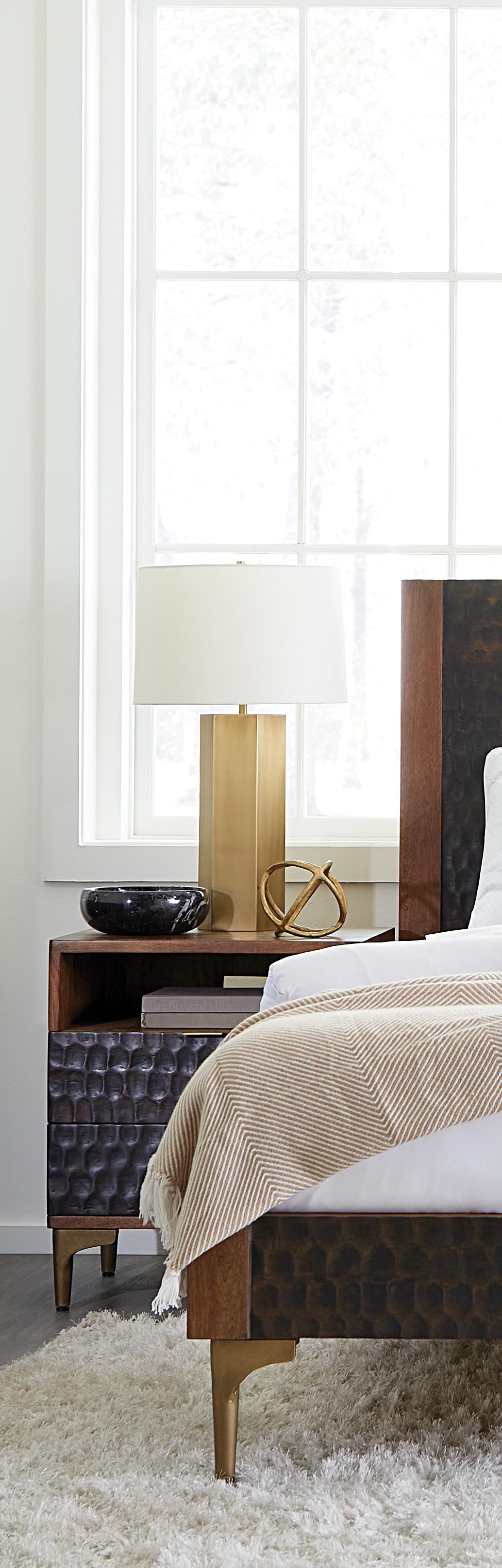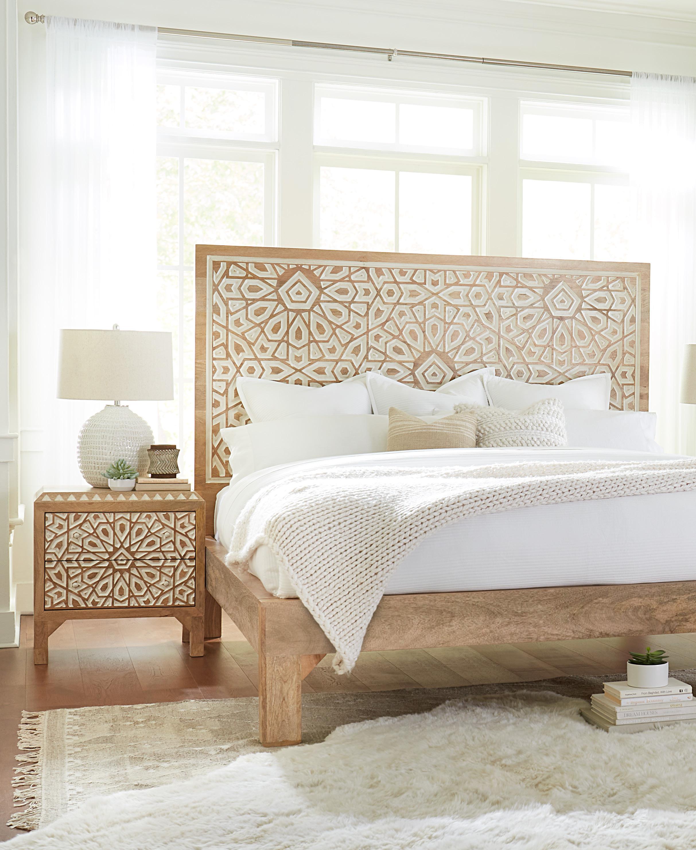 The Palermo Collection showcases a hand-carved geometric pattern, which adds subtle texture and artisanal detail. Finished in a rich royal brown, its solid wood construction combines durability with timeless style, making it a striking centerpiece for any bedroom.