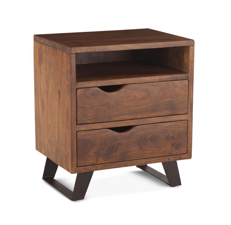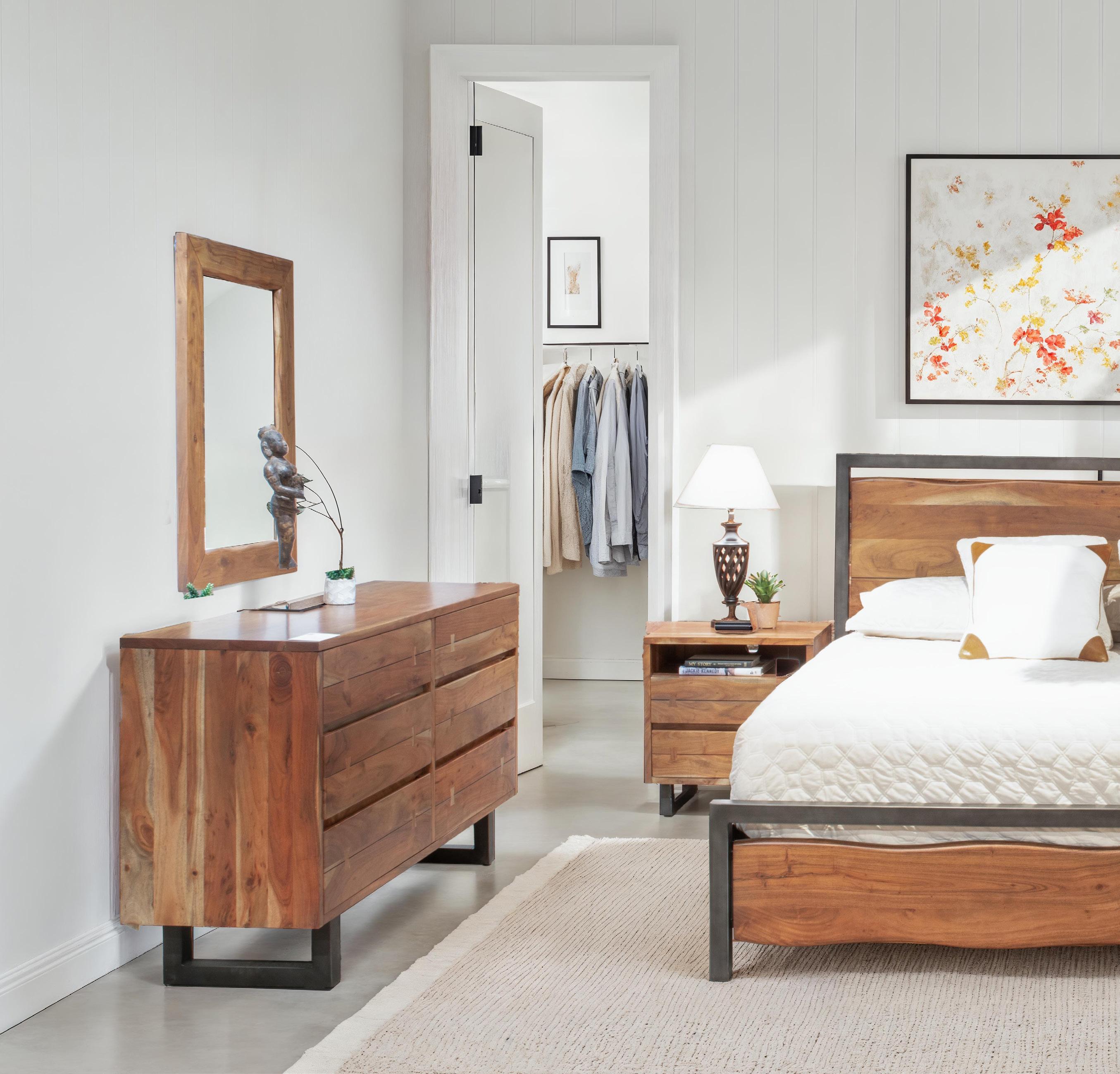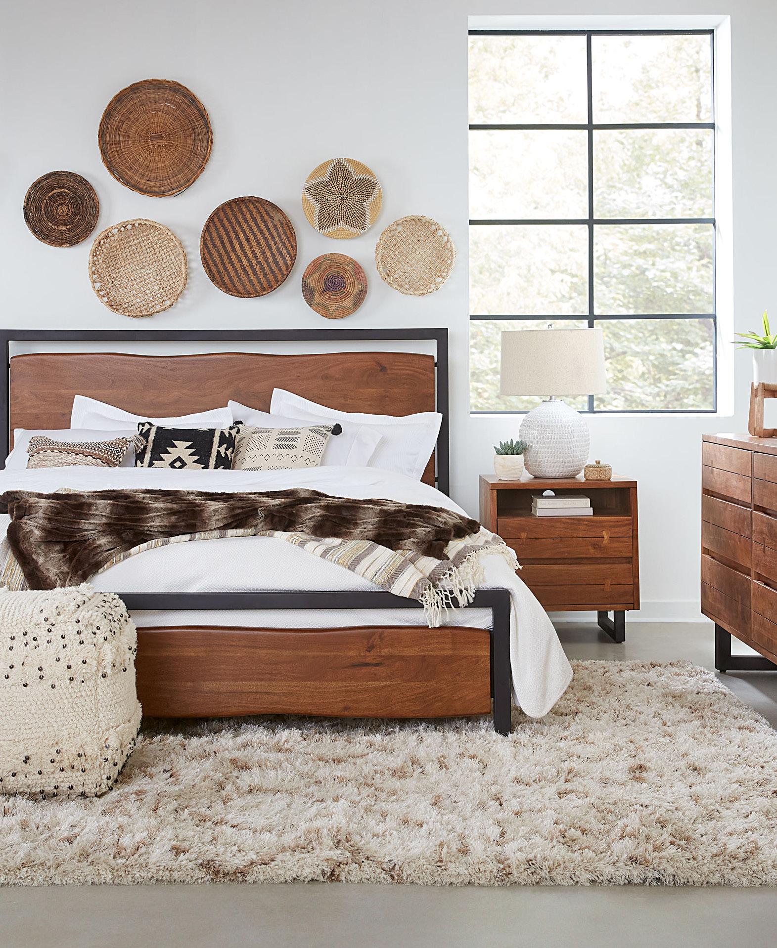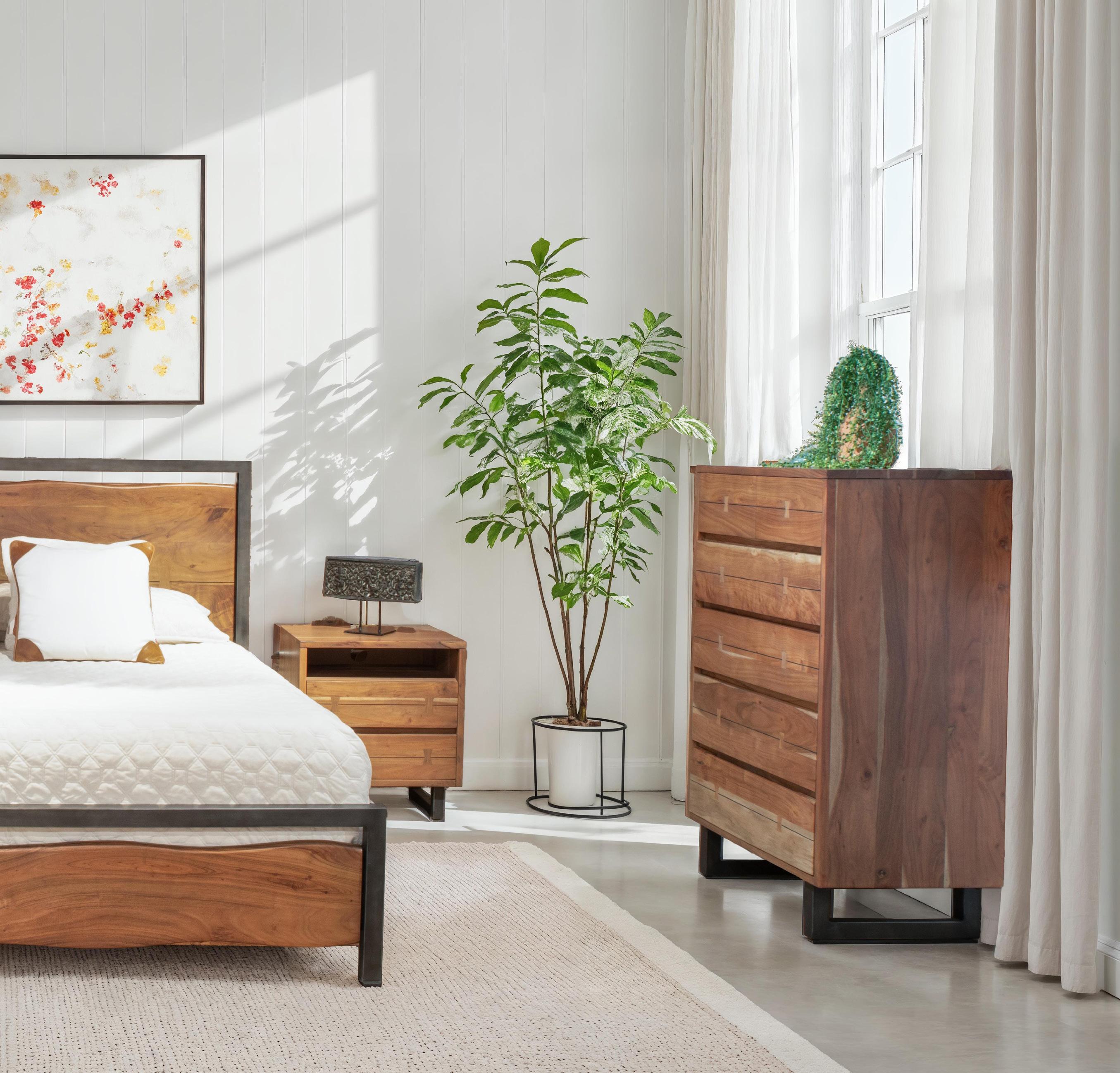 The London Loft bedroom is made from solid acacia with iron accents, featuring true live edge construction. Water based finish is both eco-friendly and durable.