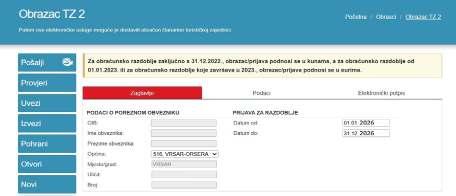 Obrazac TZ 2 koji se predaje do 15. siječnja 2026., odnosi se na razdoblje od 1. 1. do 31. 12. 2026.
