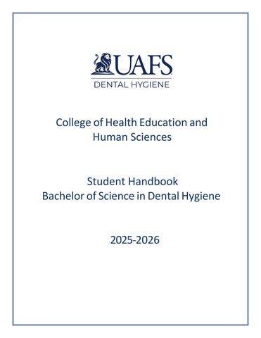 This manual is designed to serve as a guide to general information pertaining to the Dental Hygiene Program’s policies and procedures. The information provided ensures the well-being of all patients, students, faculty, and staff. Students must acquaint themselves thoroughly with the information in this manual and be responsible for following all the rules and regulations contained within. The Dental Hygiene Clinical Procedures and Policy Manual serves as a supplement to the information found in the UAFS Student Handbook Code of Conduct and the UAFS Academic Catalog, that can be accessed on the UAFS Web page at: https://catalog.uafs.edu/content.php?catoid=3&navoid=15 and https://catalog.uafs.edu/ Please note this manual supersedes the university policies in areas specific to the program Please address questions or concerns you may have with the Dental Hygiene Executive Director before signing the Acceptance of Policy Guidelines.