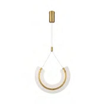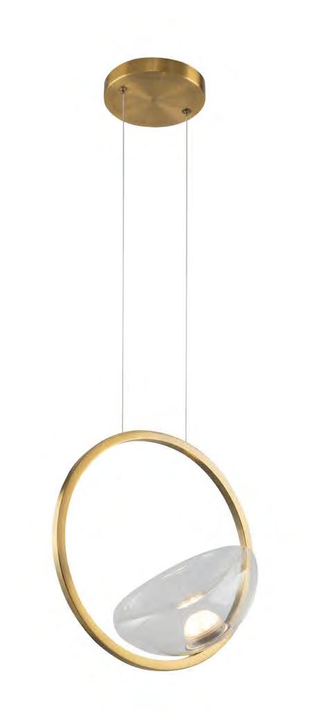 EN Fittings material— stainless steel, color — brass. Integrated LED light source. Neutral color temperature is 4000K. Trendy circle shape. The series includes pendant models of various diameters.