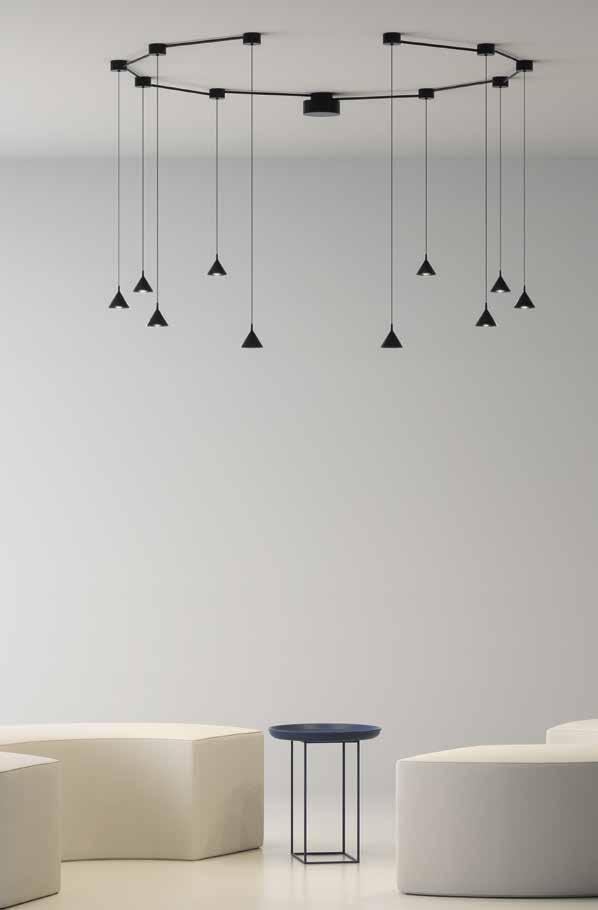 Collection of aluminum suspended lamps with glass filled nylon arch made with recycled materials. Available in four pre-defined configurations in black color. Build-in dimmable LED light source.