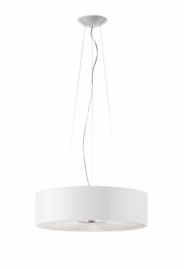 Collection consisting of suspended lamps with a metal frame covered with strips of extra smooth flameretardant pongé fabric. Available in several colours and sizes. Screw fitting light source.