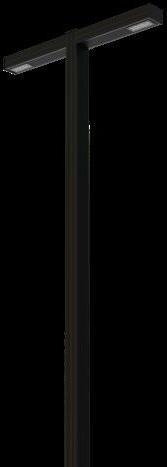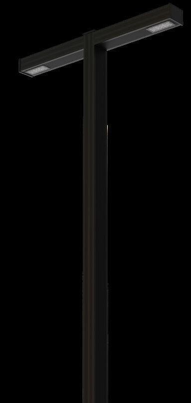 Apparecchio d’arredo urbano con braccio a T e palo in alluminio estruso anodizzato, verniciato a polvere con pretrattamento specifico per esterni. Disponibile con o senza flangia in 2 altezze. Una membrana bituminosa autoadesiva rinforzata con film in alluminio resistente al fuoco ricopre la parte inferiore del palo -versione interrata- per proteggerlo dalla corrosione. Lente in PMMA trasparente, inalterabile ai raggi UV. Asola e morsettiera 4x16mm² CLII con portafusibili e portello di chiusura. Profilo decorativo laterale ad incastro in policarbonato. Kit controflangia e tirafondi da ordinare separatamente