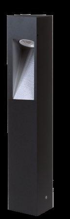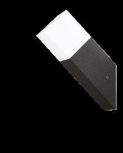 Rectangular shaped bollard with 60° tilt arm, in extruded anodized and powder-coated aluminium with pre-treatment specific for outdoor. Front closure cap in reinforced thermoplastic and base for plinth/ floor installation in galvanised steel. Non yellowing, transparent PMMA lens and interlocking decorative side profile in polycarbonate. Anchor bolts M12x200mm to be ordered separately. Applique version with wall fixing bracket in galvanised steel.