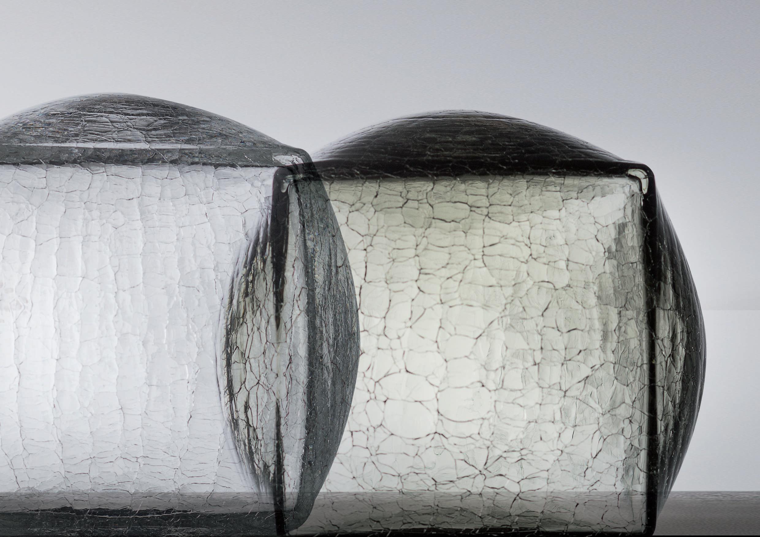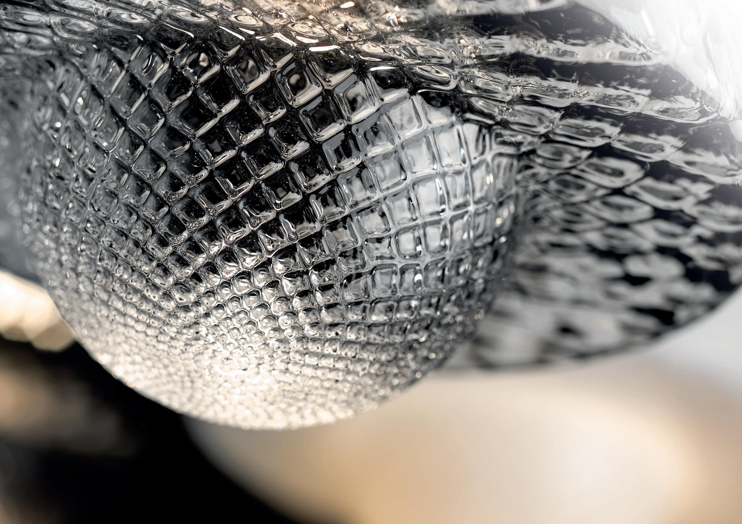 Realizzato con l’antica tecnica del “craquelé”, l’imponente diffusore in vetro della collezione MACONDO subisce un processo di trasformazione in cui il vetro incandescente incontra l’acqua fredda, dando vita alla sua caratteristica superficie “spezzata”.