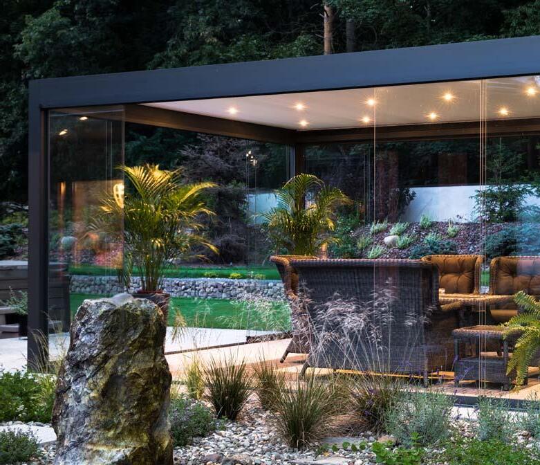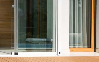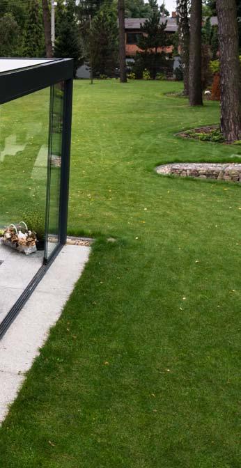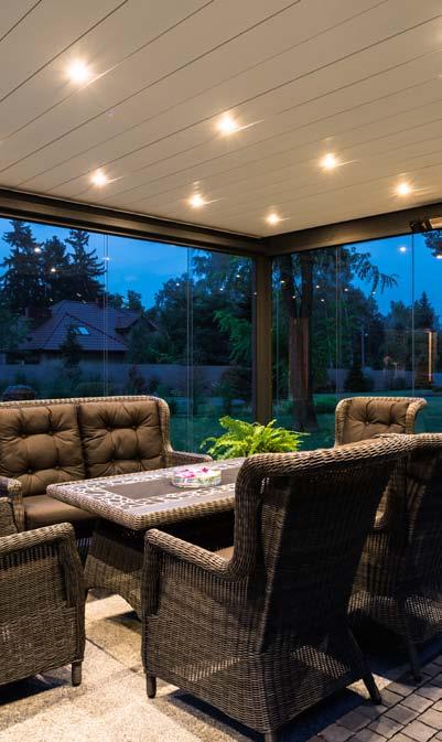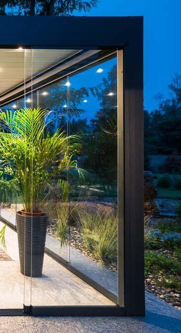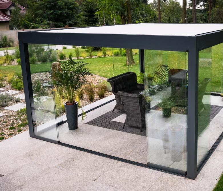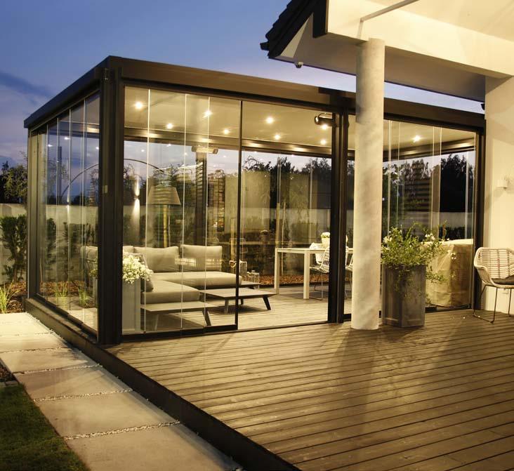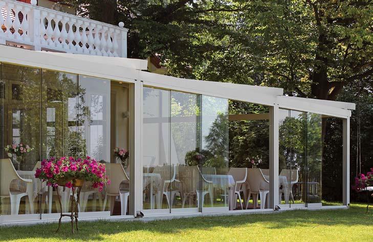 System szklanych paneli przesuwnych łączy funkcjonalność i elegancki design i pozwala przedłużyć sezon od wczesnej wiosny do późnej jesieni. To idealne rozwiązanie na przeszklenia tarasów, ogrodów lub balkonów. Bezramowe panele przesuwne po zamknięciu są niemal niewidoczne i pozwalają cieszyć się otoczeniem przy zmiennych warunkach atmosferycznych. Zastosowane szkło hartowane jest bezpieczne w użytkowaniu. System pozwala na użycie od 2 do 10 paneli, które poruszają się po pięciotorowym torze za pomocą wózków jezdnych.