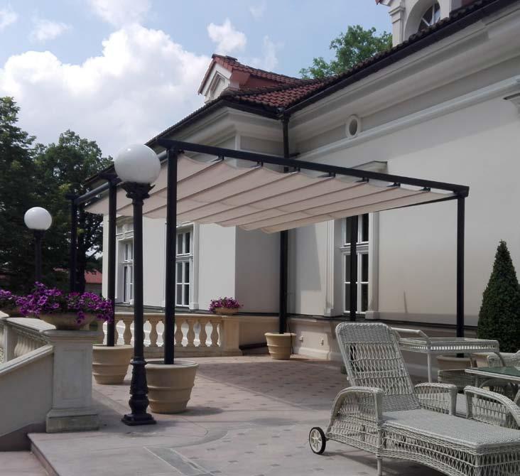 Elegant, classic and the most popular terrace canopy in our offer. This product fits into any architectonical frames. Elegancy combines simplicity and luxury. Thanks to modern technological solutions introduced to its structure, it is an easy and practical option. The construction of the terrace pergola consists of an aluminium basis, a shed roof made of a Tech-protect fabric and a systemic canopy which protects the material when folded. Carefully selected elements of the additional equipment can make a terrace, restaurant garden or patio the most important place intended to be used for chilling out, parties or family dinners from the early spring till the late autumn.