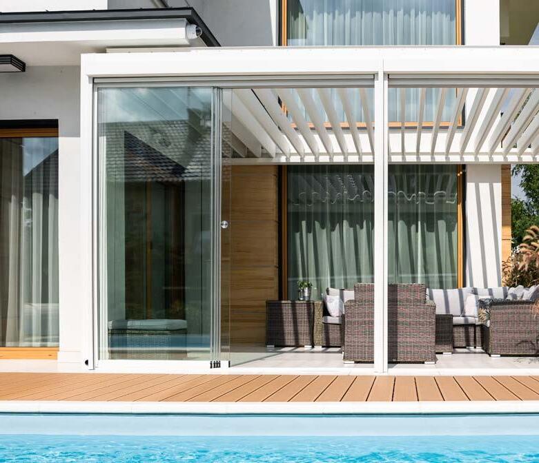 Unsere verschiebbare Verglasungen verbinden in sich Funktionalität und ein elegantes Design. Verglasungen ermöglichen einen nahen Kontakt zur Natur bei einer gleichzeitigen Wahrung der Distanz. Ein System passt an jede schon bestehende Architektur und kann in verschiedenen Räumen, wie Pergolen, Balkons, Terrassen, Loggien und Konferenzräume montiert werden. Diese Lösung beruht auf horizontal schiebbaren Paneelen, die sich mit Hilfe von einem Schiebemechanismus auf einem Aluminiumprofil mit fünf Gleisen bewegen. Die Paneele schützen vor ungünstigen Wetterbedingungen. Nach dem Schließen sind die rahmenlosen schiebbaren Paneele fast unsichtbar.