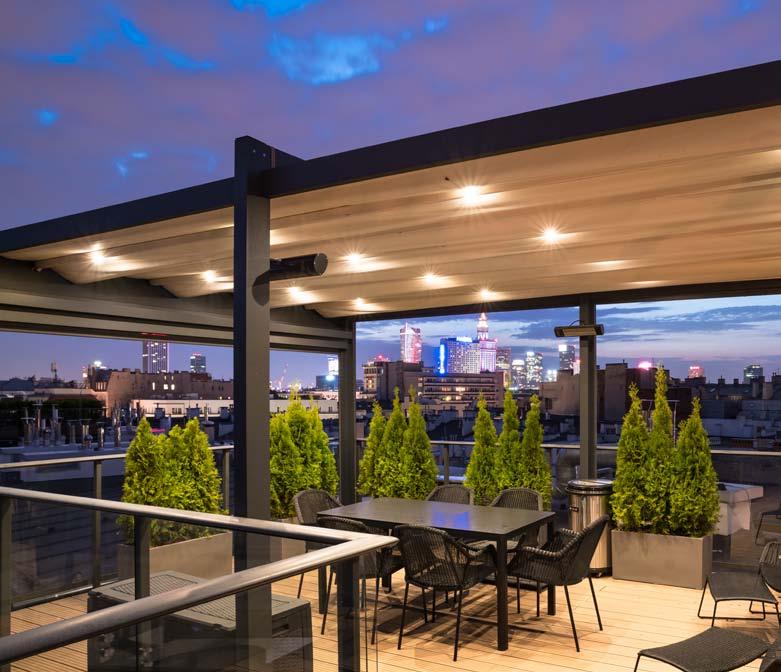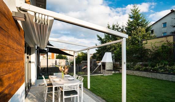 Flat is a solution which was created especially for modern architecture. Keeping the right angles makes it fit into the modern architectural forms perfectly. Its construction consists of mouldings made of extruded aluminium, foldable canopy made of fabric and systemic roof. The most characteristic features of this construction are visual lightness and simplicity, whereas its structure is very solid and adjusted as well as resistant to the tough and changing weather conditions. Carefully selected elements of the additional equipment enable spending time on the terrace till the late autumn.