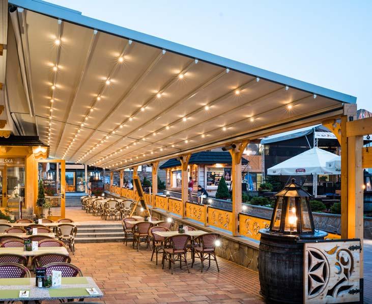 Light is a modern product created especially for the medium and big terraces. Its characteristic feature is thrift in case of joining with simultaneous preservation of durability and stability of the construction. This construction has to be attached to the wall of the building. It is possible to install some additional elements such as integrated lighting and heat radiators. Tarasola Light is a product tailored especially for a demanding client—its aim is to protect all users from sun and rain.