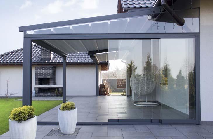 Light ist ein modernes, den mittelgroßen Überdachungen und großen Terrassen gewidmetes Produkt. Sie charakterisiert sich durch eine unkomplizierte Verbindung sowie eine beständige und stabile Konstruktion. Dank einer unsichtbaren Verbindung der Führungsschienen mit den Stützenprofilen bekommen wir ein modernes Produkt mit einem leichten Aussehen. Die Konstruktion aus extrudierten Aluminiumprofilen wird ausschließlich an die Wand des Gebäudes montiert. Man kann hier auch Ergänzungsprodukte, wie integrierte Beleuchtung oder Wärmestrahler verwenden. Tarasola Light ist ein den Bedürfnissen eines anspruchsvollen Kunden entsprechendes Modell zum Schutz vor Sonne und Regen.