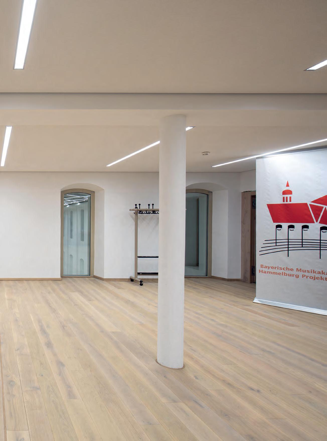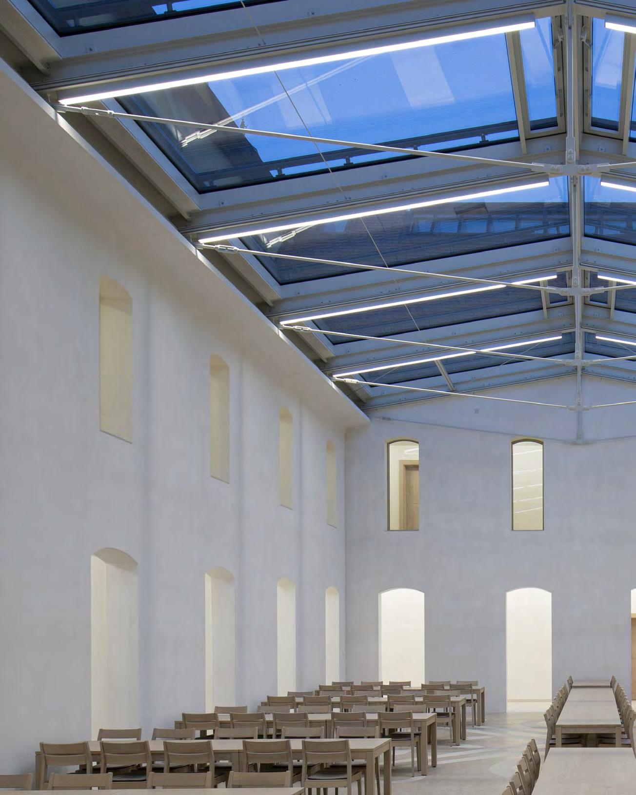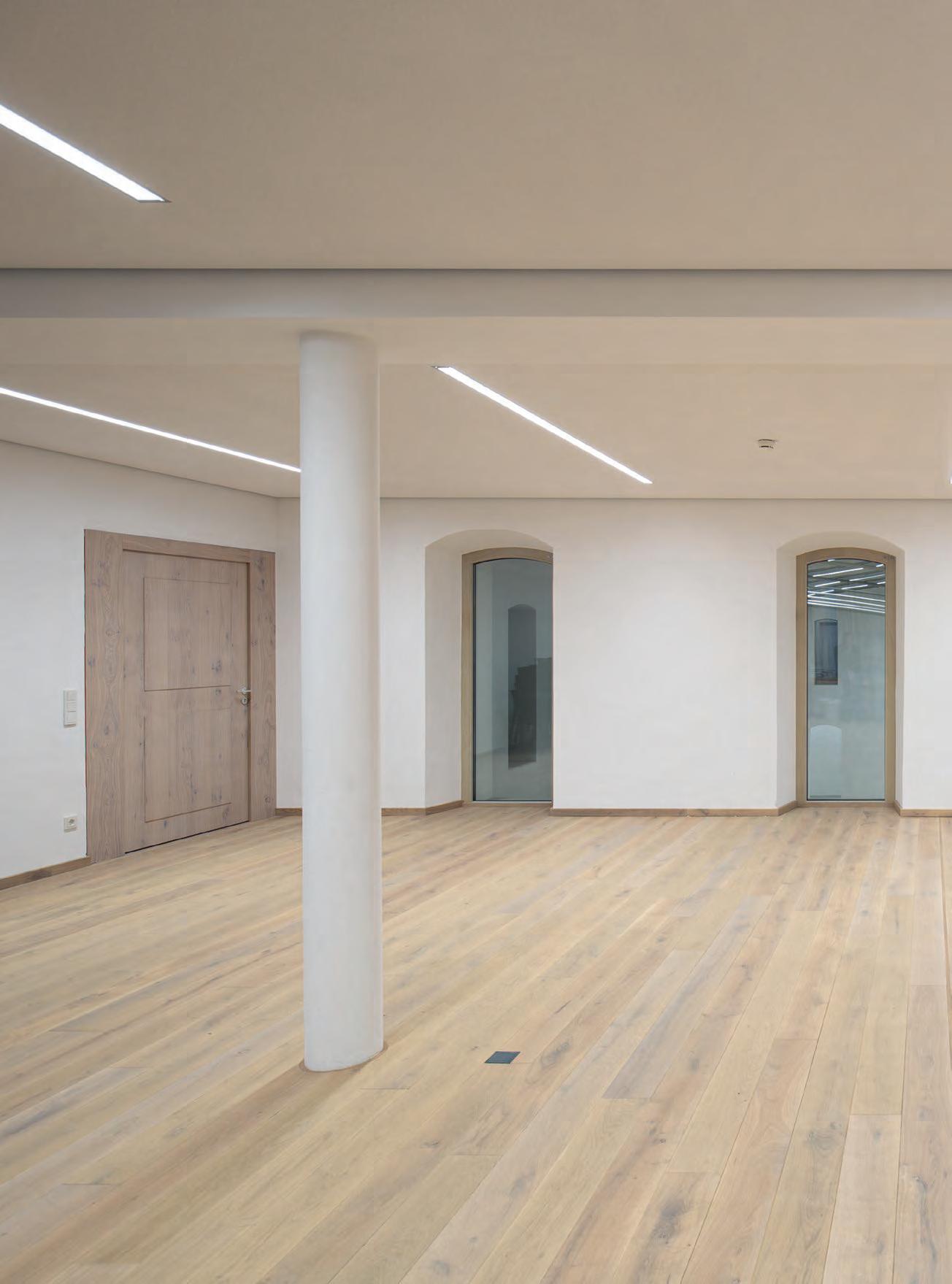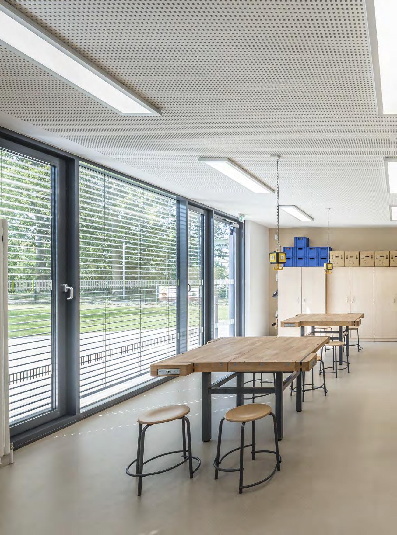 In verkleinerter Bauform wurde die lopia Q auch in den Fluren, Trppenhäusern und Umkleiden eingesetzt – hier als lopia Q 330-EG. Die Leuchtenfamilie verbindet diese Bereiche durch das einheitliche Erscheinungsbild und trägt mit ihrer homogenen Ausleuchtung wesentlich zur harmonischen Gestaltung der Raumatmosphäre bei.