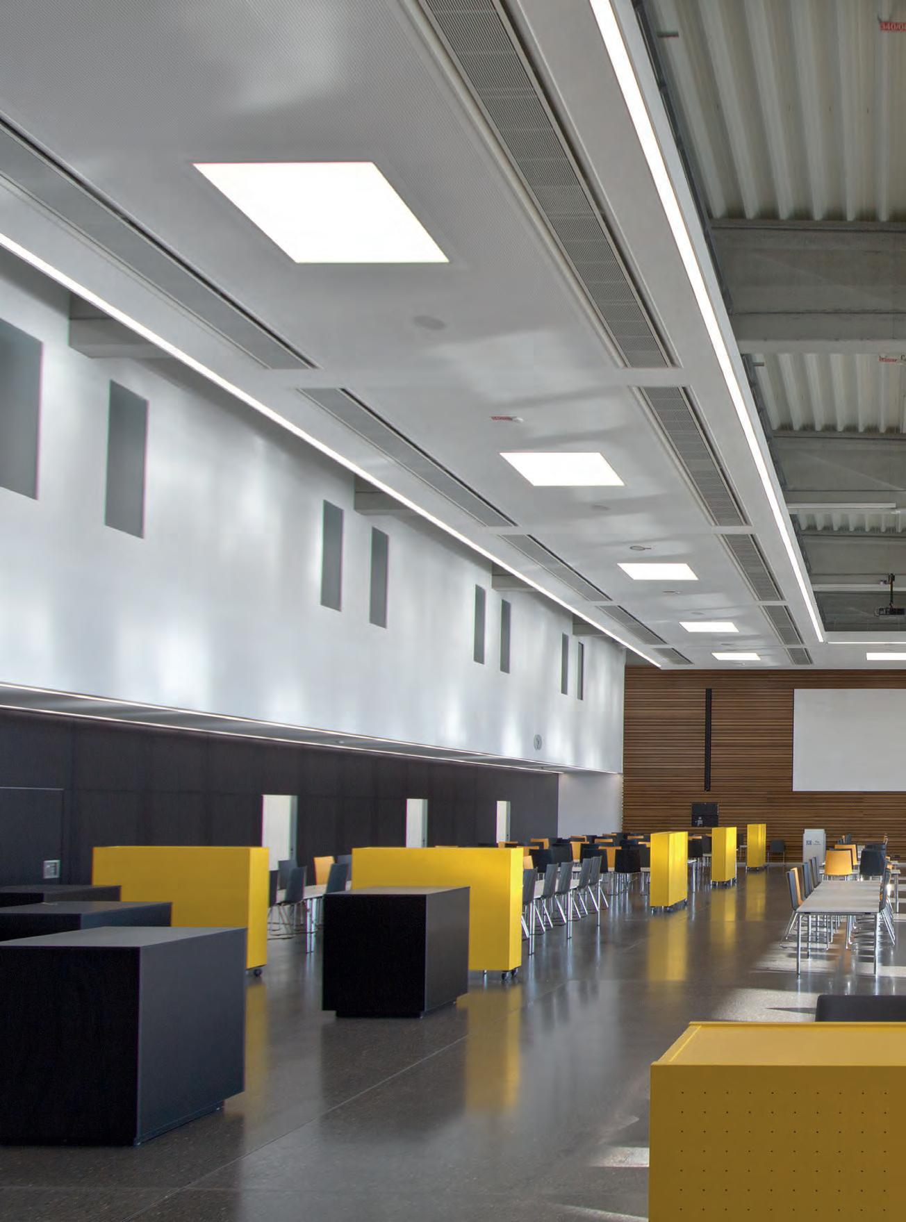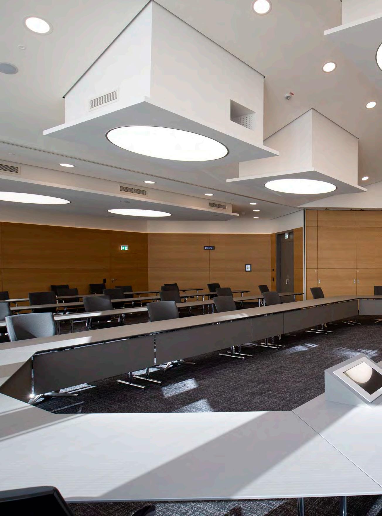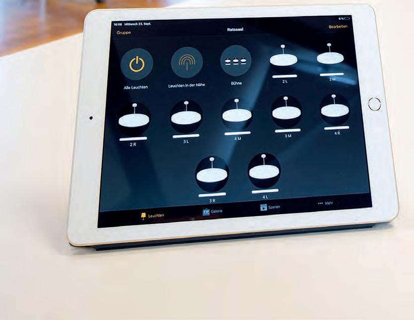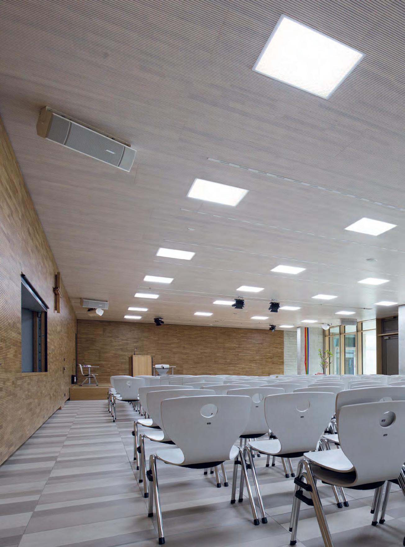 Für den großen Auftritt in der Aula sorgen die LED-Einbauleuchten „lopia Q“. Die Leuchten erzielen mit Tunable-White-Technik die perfekte Lichtstimmung - ein lichttechnisches Highlight. Sie sind in der Lage, über eine Steuerung ihre Lichtfarbe zwischen 3.000 und 6.500 Kelvin zu verändern – von Warmweiß über Neutral- bis zu Kaltweiß. Dadurch bietet sich die Möglichkeit, je nach Veranstaltung und Tageszeit mit der Lichtfarbe auf unterschiedliche Anforderungen zu reagieren.