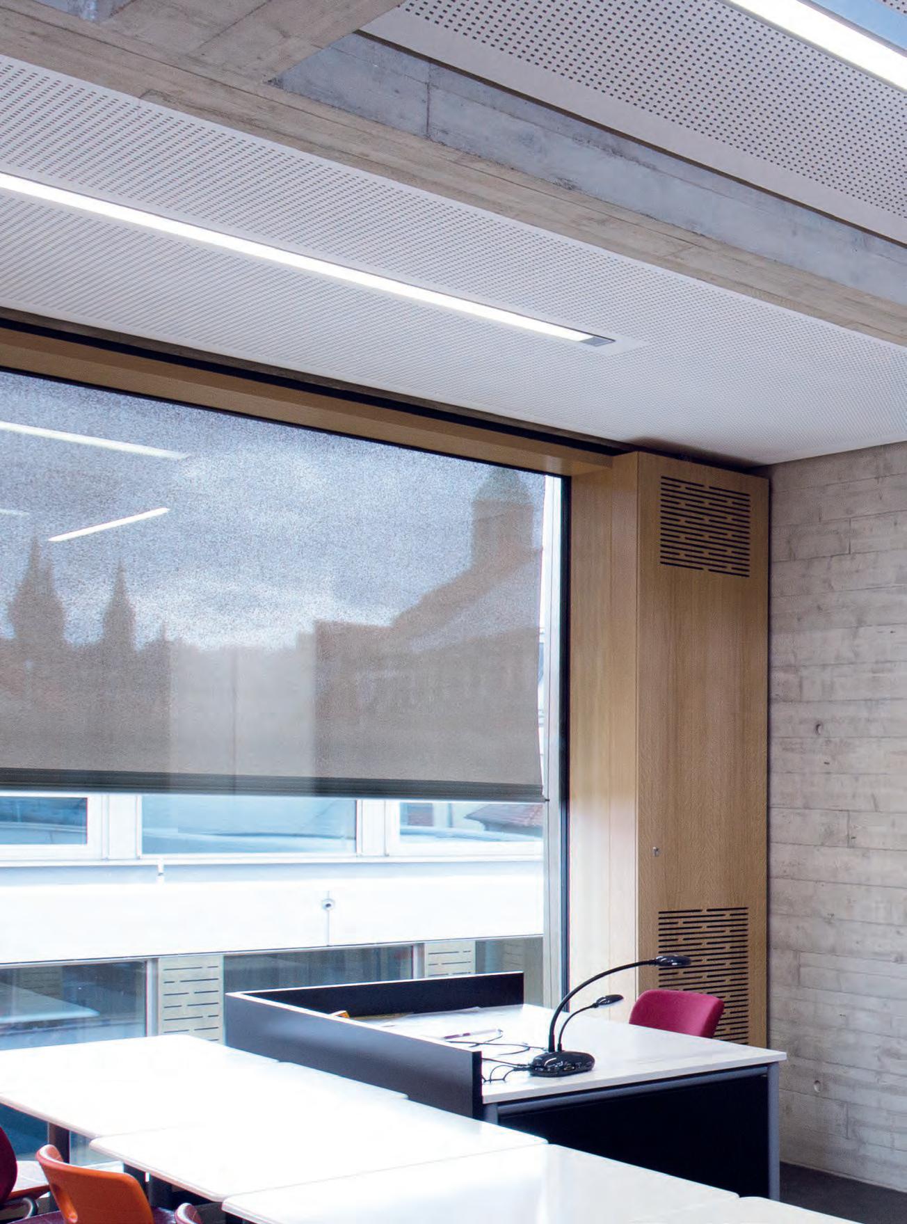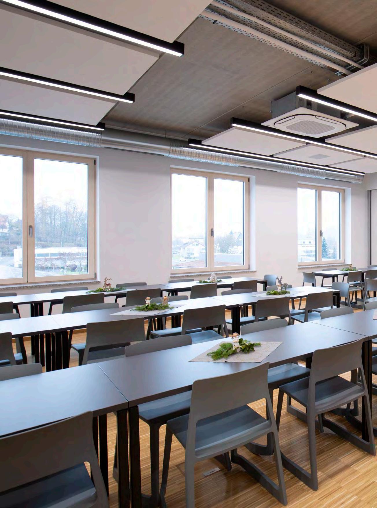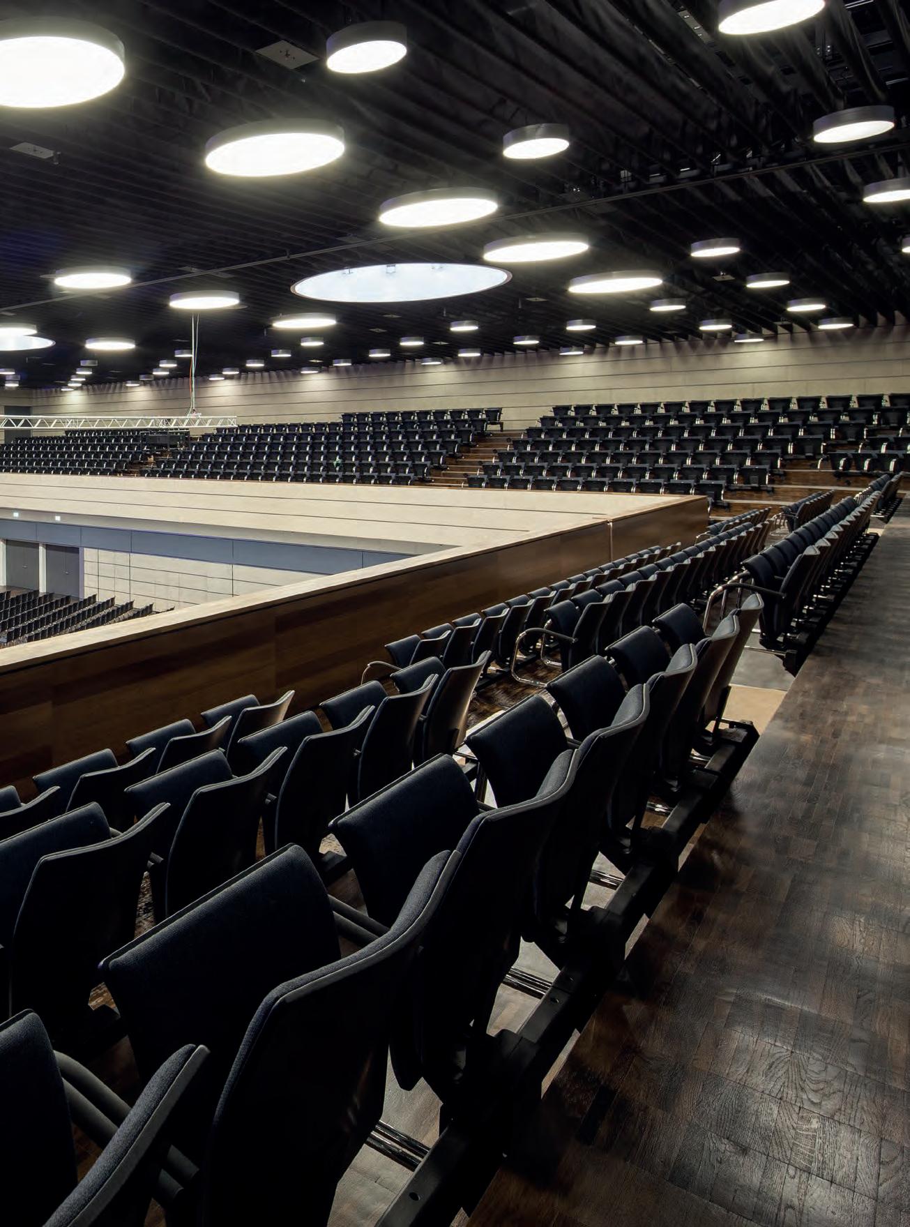 Für den großen Auftritt in der Aula sorgen die LED-Einbauleuchten „lopia Q“. Die Leuchten erzielen mit Tunable-White-Technik die perfekte Lichtstimmung - ein lichttechnisches Highlight. Sie sind in der Lage, über eine Steuerung ihre Lichtfarbe zwischen 3.000 und 6.500 Kelvin zu verändern – von Warmweiß über Neutral- bis zu Kaltweiß. Dadurch bietet sich die Möglichkeit, je nach Veranstaltung und Tageszeit mit der Lichtfarbe auf unterschiedliche Anforderungen zu reagieren.