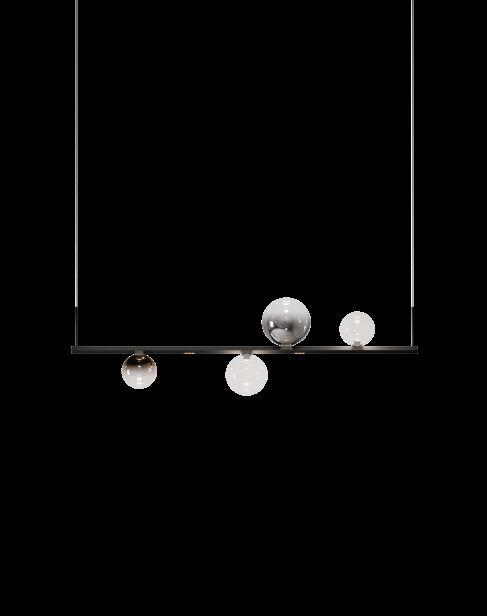 Random Stick extends the collection of the same name designed by Chia–Ying Lee with a stand-alone suspension lamp that has an essential yet highly decorative character. Random’s poetic spheres of light find their place on a hexagonal bar, reminiscent of fragile soap bubbles skimming the surface before taking flight again. The lamp, available in two bar lengths – 100 cm and 150 cm – lends itself to illuminating long, rectangular surfaces of various sizes, such as a dining table or a cocktail bar counter. The spheres pick up on Random’s seven finishes, freely combinable on polished gold, polished black, and matt white bars to create original colour combinations and luminous effects. The decorative function of the spheres is further enhanced by LED modules at the bottom of the bar, complementing the light already diffused by the spheres and ensuring uniform downward brightness.