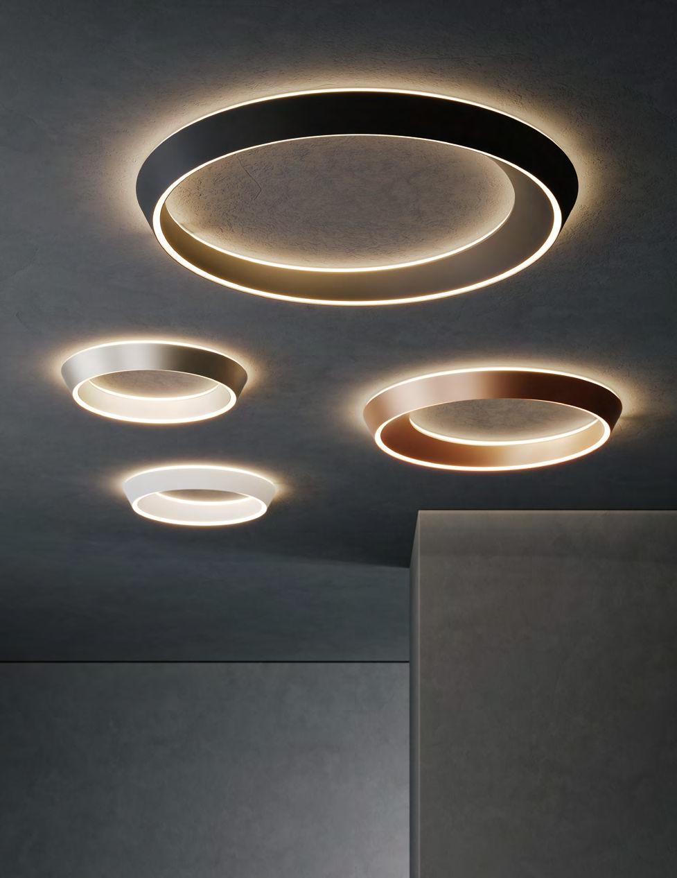 Tidal ist eine Deckenleuchte mit hoher Leuchteffizienz, die das Wesen der Bewegungen der Himmelskörper und der Gezeiten mit einem fließenden, effektvollen Design einfängt: Die Leuchte wirkt je nach Blickwinkel von unten anders, da sie eine unregelmäßige, asymmetrische Form hat, bei der eine Seite breiter ist als die andere. Der Leuchtenkörper aus Aluminiumdruckguss projiziert das Licht gleichzeitig nach unten und nach oben, während der Ring die technischen Elemente im Inneren verbirgt und den ästhetischen Wert des Objekts unterstreicht.