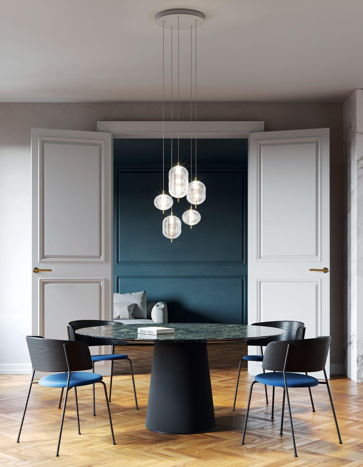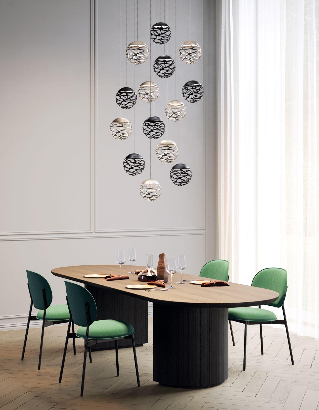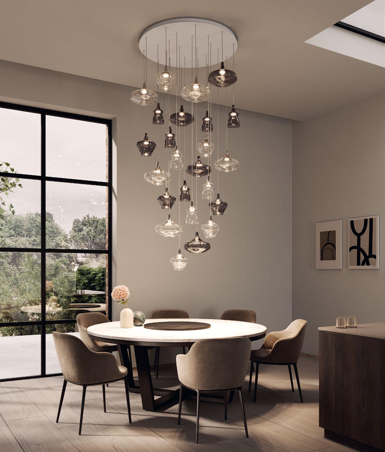 Darüber hinaus ist Elara über einen an der Wand angebrachten Dimmer stufenlos regelbar, so dass die Lichtintensität je nach Bedarf angepasst werden kann, um individuellen Beleuchtungskonzepten gerecht zu werden. Erhältlich in zwei Größen, Medium (Ø 60 cm) und Large (Ø 80 cm), eignet sich Elara für eine Vielzahl von Umgebungen, wie z. B. über einem Esstisch im Wohnbereich oder als Teil einer größeren Installation in öffentlichen Räumen, wie einer HotelLounge oder einem Restaurant. DE